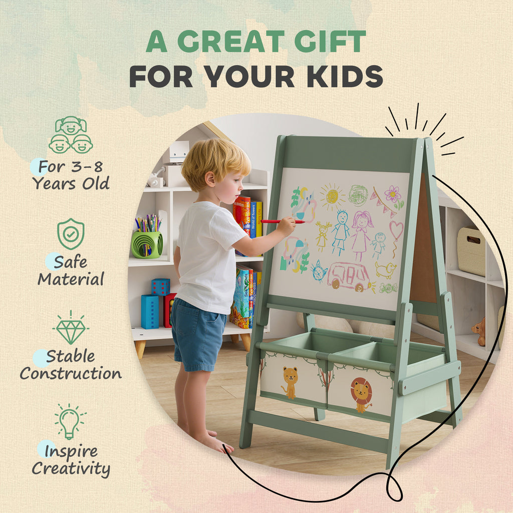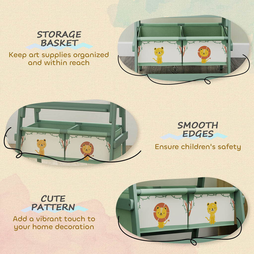 Wake up your child's creative side with this AIYAPLAY kids easel – a fun 3-in-1 design featuring a chalkboard, whiteboard and pull-down paper roll. Great for drawing, painting and games like hangman or noughts and crosses, it brings hours of imagination to life. Two storage boxes keep art supplies tidy and within reach. Made from stolid pinewood and MDF, it stands strong through every masterpiece, while the vibrant green colour and playful patterns add charm to any playroom or bedroom.