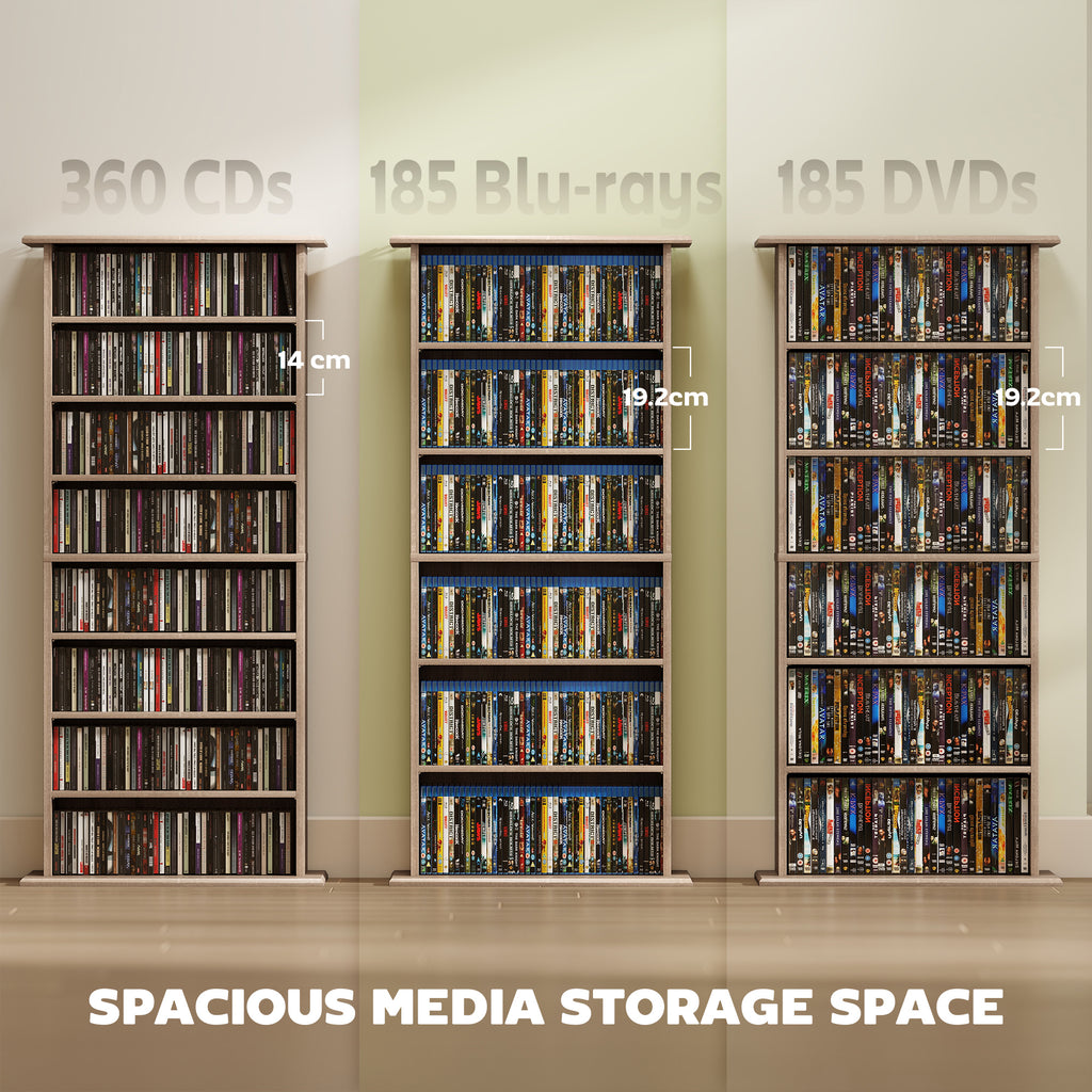 - 8 compartments, with 6 adjustable shelves: room for 360 CDs, 185 DVDs or 185 Blu-rays