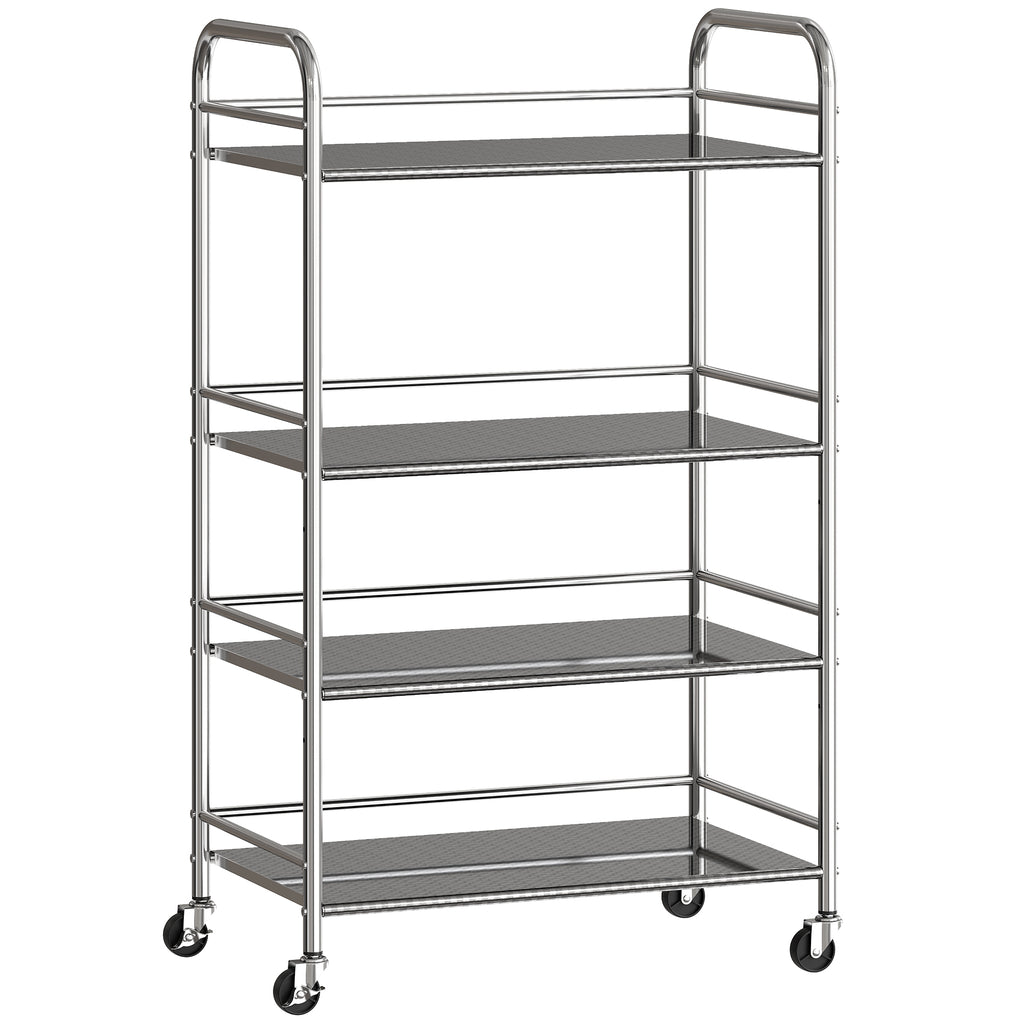 Struggling with cluttered kitchen spaces and items that just don't fit? Our 4-tier storage trolley from HOMCOM offers the great solution. Two middle shelves are adjustable to accommodate any kitchenware or appliance. Glide this versatile serving trolley smoothly between rooms, then securely lock it in place for stability. Built with robust 201 stainless steel, the rolling cart resists corrosion and scratches, ensuring lasting durability and a more organised, serene home setting.