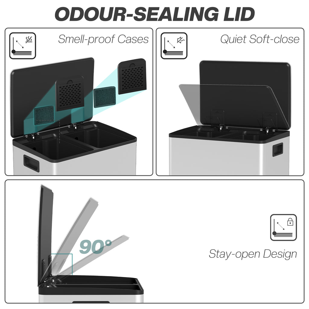 Double the compact hygiene, for the kitchen and beyond: this HOMCOM 25L double kitchen pedal bin. Made from stainless steel, this trash bin is strong piece suited for everyday use; the two-compartment design allows you to separate waste as needed. Place deodorisers in the lid slots to keep the smell fresh, with a stay-open option for super easy cleaning. So, when you feel stuck on space, go for this small but mighty dual rubbish bin.