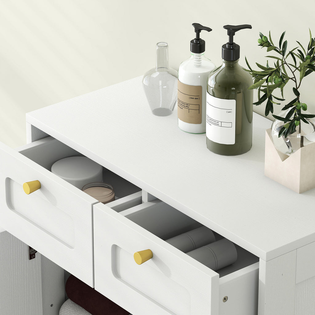 Bring calm and order to your bathroom with this stylish floor cabinet from HOMCOM. Whether it's storing spare towels, skincare, or cleaning essentials, the mix of drawers and a roomy cupboard keeps everything tucked neatly away. The adjustable shelf makes it easy to fit taller bottles, while the strong build supports up to 55 kg—great for daily family use. Finished in soft white with arched doors and gold-tone touches, the bathroom storage unit adds a gentle, classic charm to your space.