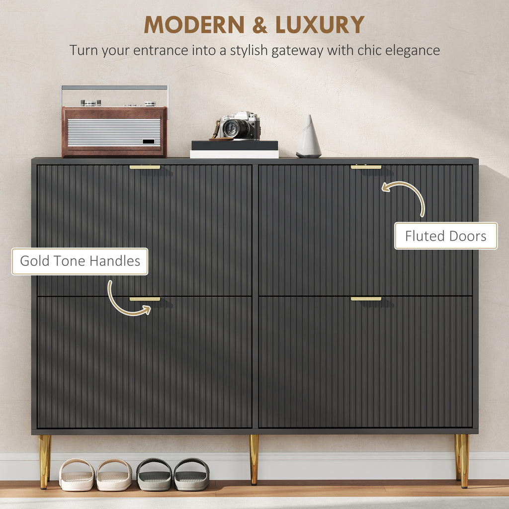 Easy elegance in footwear storage form, with this HOMCOM shoe cabinet. In a soft white hue, it comes with ridged front doors for a touch of texture; complemented with gold-coloured details. It has four drawers, which holds 10-20 pairs of shoe pairs; the adjustable shelf in each drawer makes it easy to fit in differently-sized footwear. Anti-tipping kit included for safety.