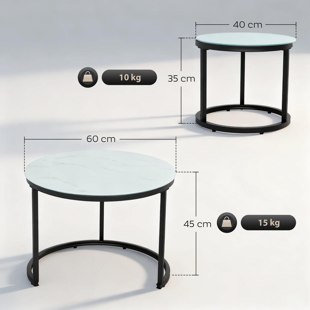 Double the character for your space, with this HOMCOM nesting table set. It can be used separately or independently, throughout the living room, bedroom and office. Steel frames for a strong structure, with marble-effect tempered glass tabletops for a sleek touch. Let these two living room tables bring style and functionality to your space.