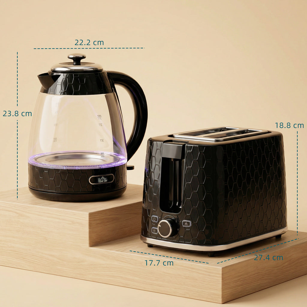 Start your mornings right with HOMCOM's 2-slice toaster and 1.7L fast-boil kettle duo! Prepare toast and hot drinks together, making breakfast effortless for the family. The kettle boils water in 170 seconds, with a clear gauge, blue light, plus safety features like auto shut-off, boil-dryand overheat protection. Meanwhile, the toaster's seven browning levels cater to every taste, ensuring golden, crispy perfection for busy mornings. Stylish, safeand easy to use!
