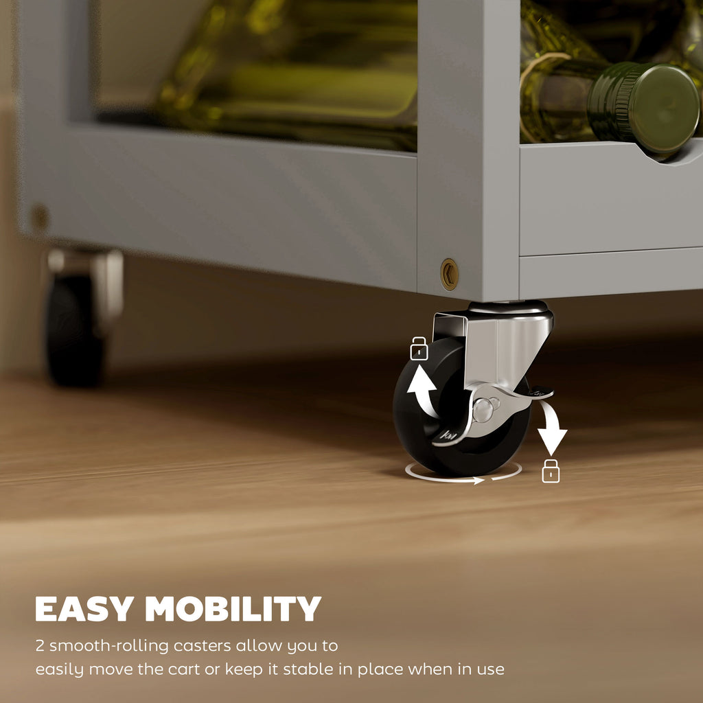 This storage trolley on wheels is a great option for any kitchen and dining space - no matter the size. Comes with a drawer, three three-bottle wine shelves and three cabinets provide plenty of room for holding everything together. Wheels allow you to move it where you desire. The rubberwood countertop is hard for prepping drinks garnishes when friends come over. Simple, white clean design - a modern home addition.