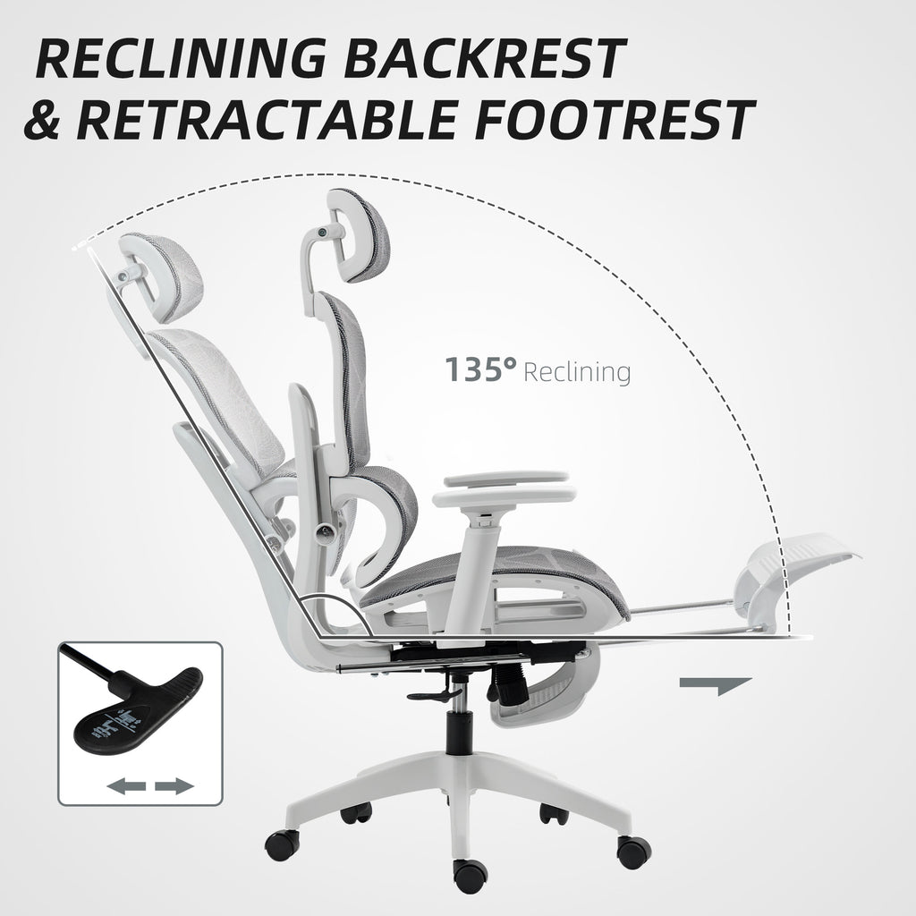 Support and comfort with this HOMCOM ergonomic office chair. The 135° reclining back, with three lockable positions, is paired with the manuel footrest to elevate your lower body. Enjoy the flexibility of the adjustable headrest, 3D armrest that adjusts up/down, forward/backward and left/right, adjustable lumbar support, 114-122cm seat height and depth adjustment. Complete with five wheels to move it around easily.