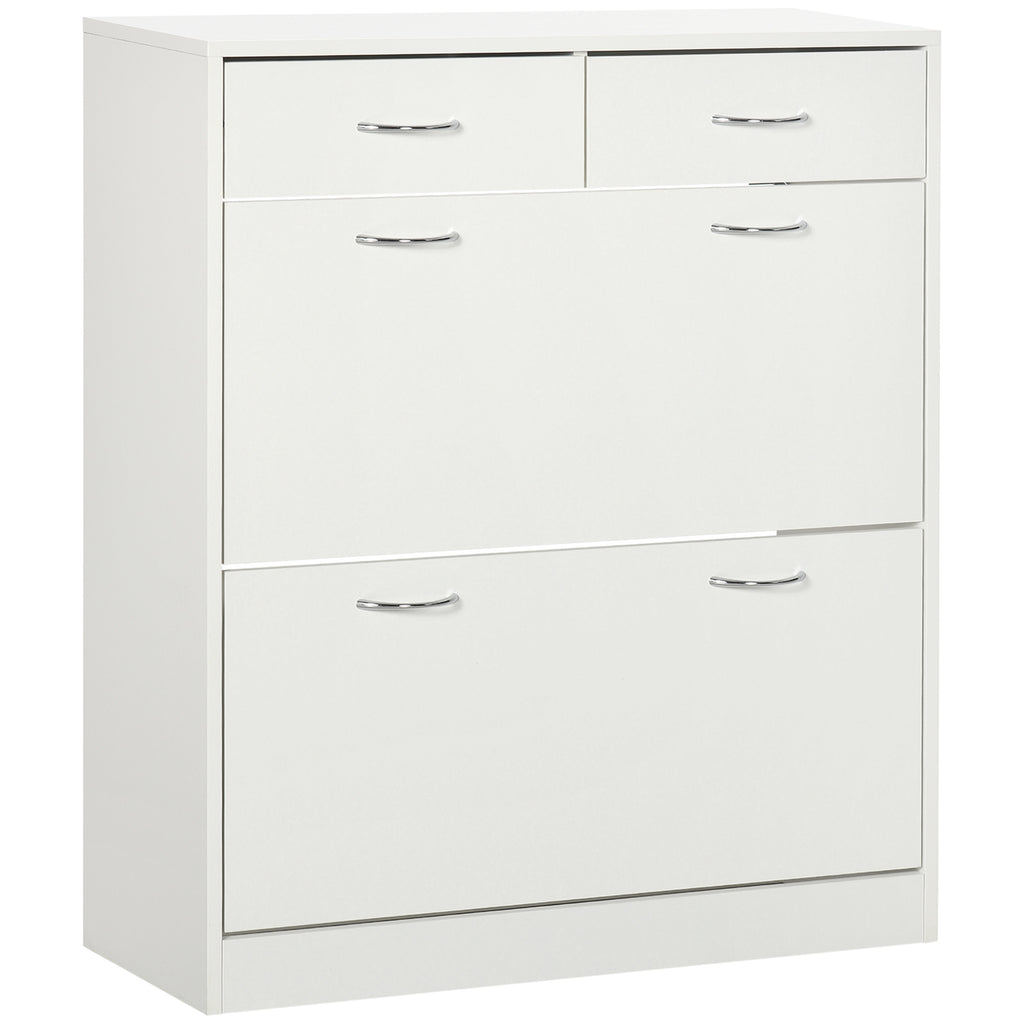 This HOMCOM tall and narrow shoe cabinet is great for all homes; great for smaller spaces. Features two flip doors with a middle adjustable shelf: holds up to 12 shoe pairs, maximum UK size 9.5. Two top drawers and a flat top for extra display and holding room. Made from particle board, this is a solid piece for the everyday; finished with anti-tipping straps for safety.