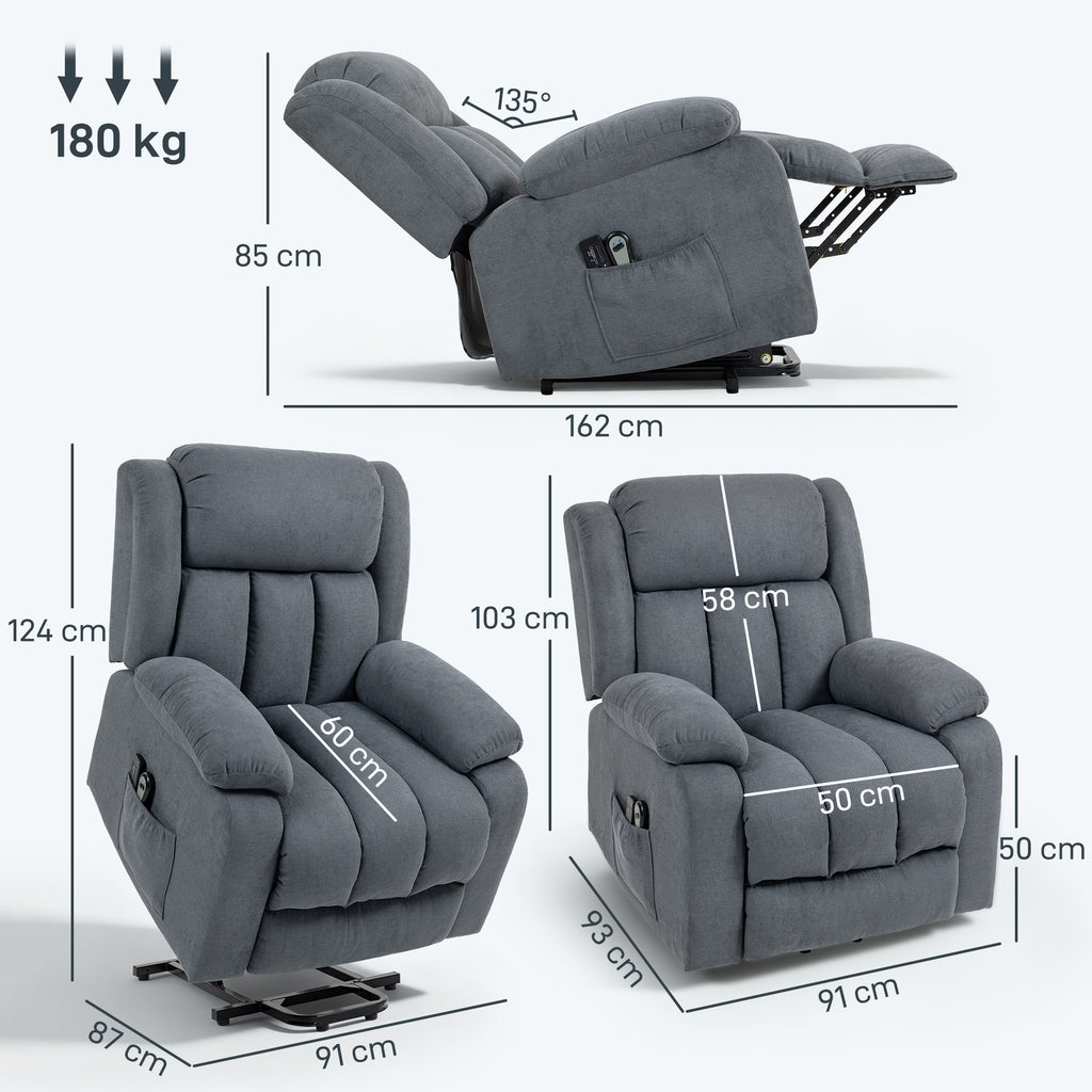 Bring assistance into your life whilst keeping your independence: look to this HOMCOM lift-up electric recliner chair. Thickly padded all over to keep you comfortable, it features a 135° reclining back and footrest: control them with the remote to set chair in a position you want. The gentle lifting angle makes it easy to sit down and get out of the chair. Eight massage points soothe all those aches away. This recliner is a truly powerful multi-tasker.