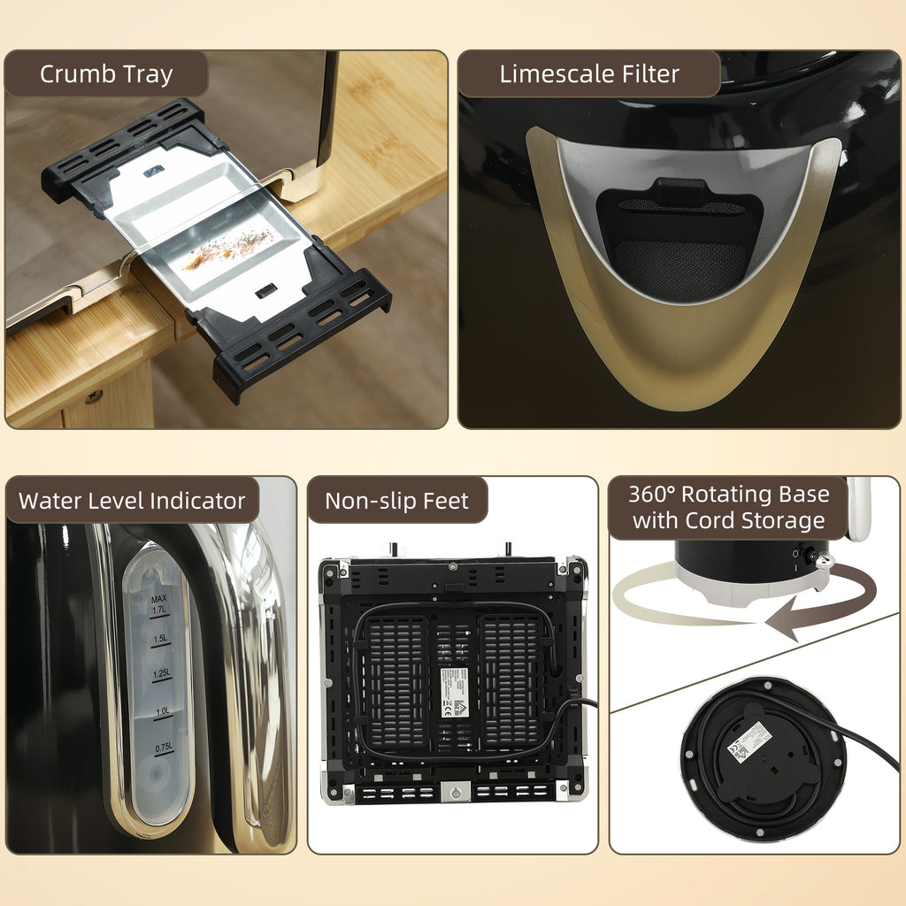 Time to make a statement on your countertop, with this HOMCOM kettle and toaster set. A retro-inspired design, it blends together a block colour with silver-tone accents, in a smooth curved shape. The set comes with a 3000W rapid boil kettle and four-slice toaster: everything you need for that brew and toast - morning and evening. And thanks to the wide 3.5 cm slots on the toaster, it even fits delicious thick bread.