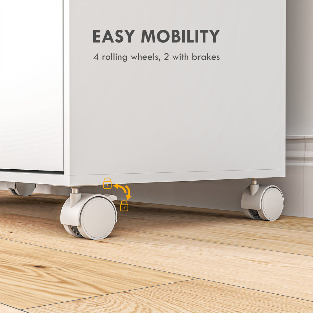Transform your ironing with the HOMCOM Rolling Ironing Board Cabinet! This clever unit features a foldable top for space-saving ease and unfolds quickly for smooth ironing. It's your organised storage solution with a spacious clothes rail, an open compartment and a cabinet with an adjustable shelf. Plus, with four PU wheels, two with brakes, you can move it effortlessly while ensuring stability.