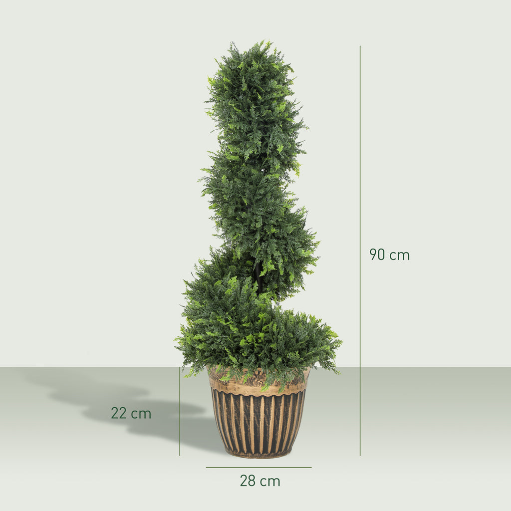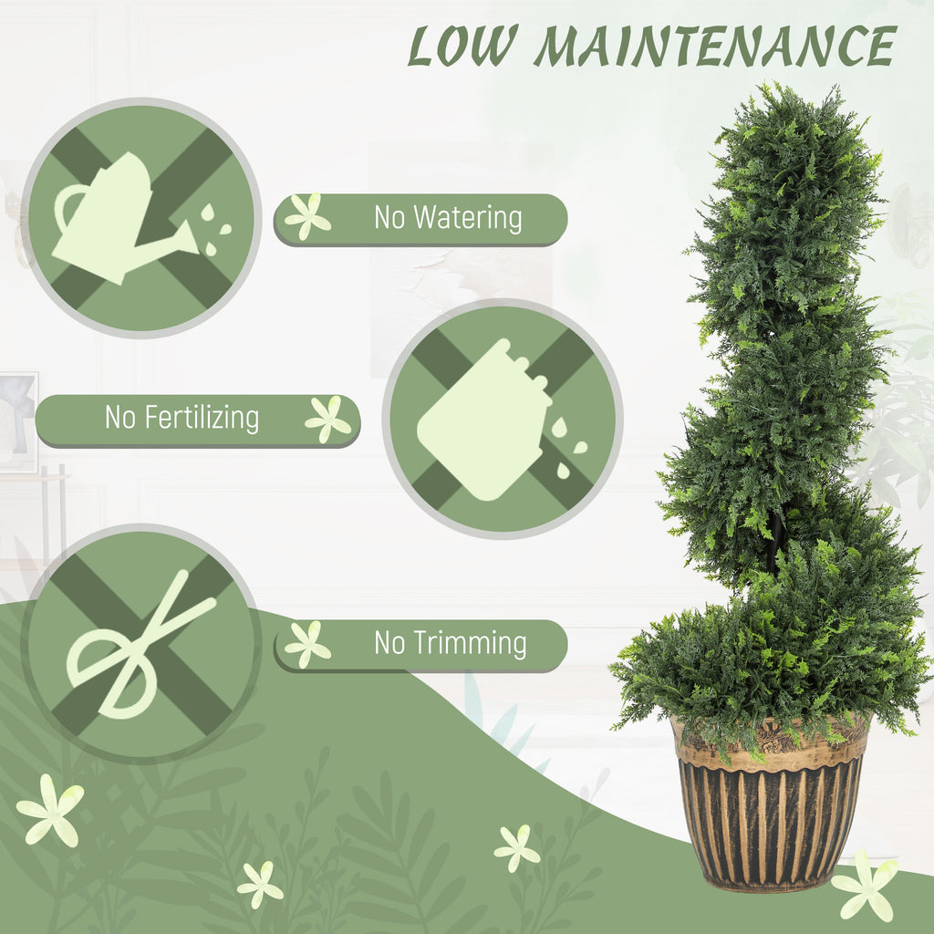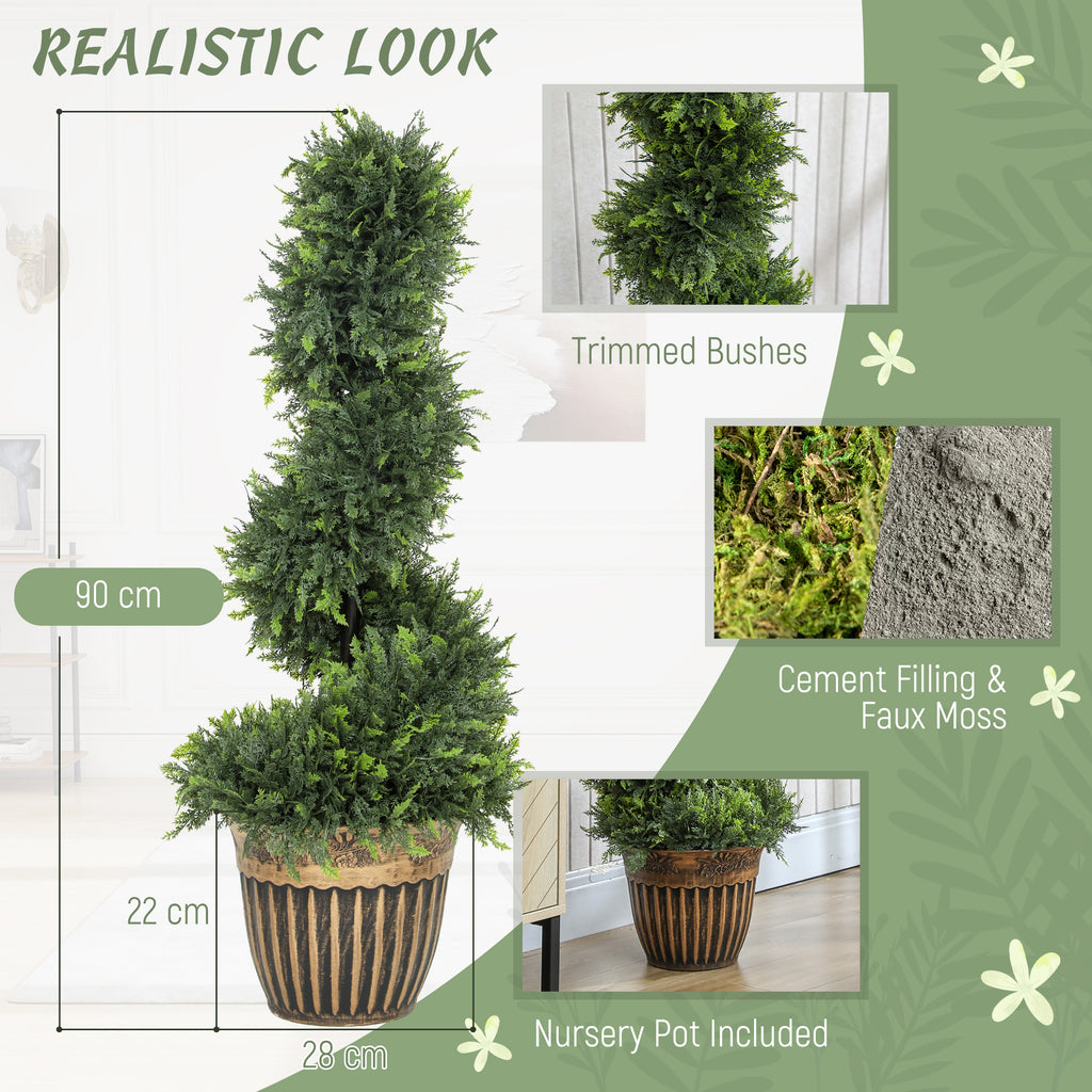 Green plastic plants, all year round with these two HOMCOM spiral boxwood trees. The faux plants will stay green for many years; no trimming or shaping required. Each plant has 650 leaves - realistic colour and texture for a realistic look. They come with cement-filled pots to keep weighted.