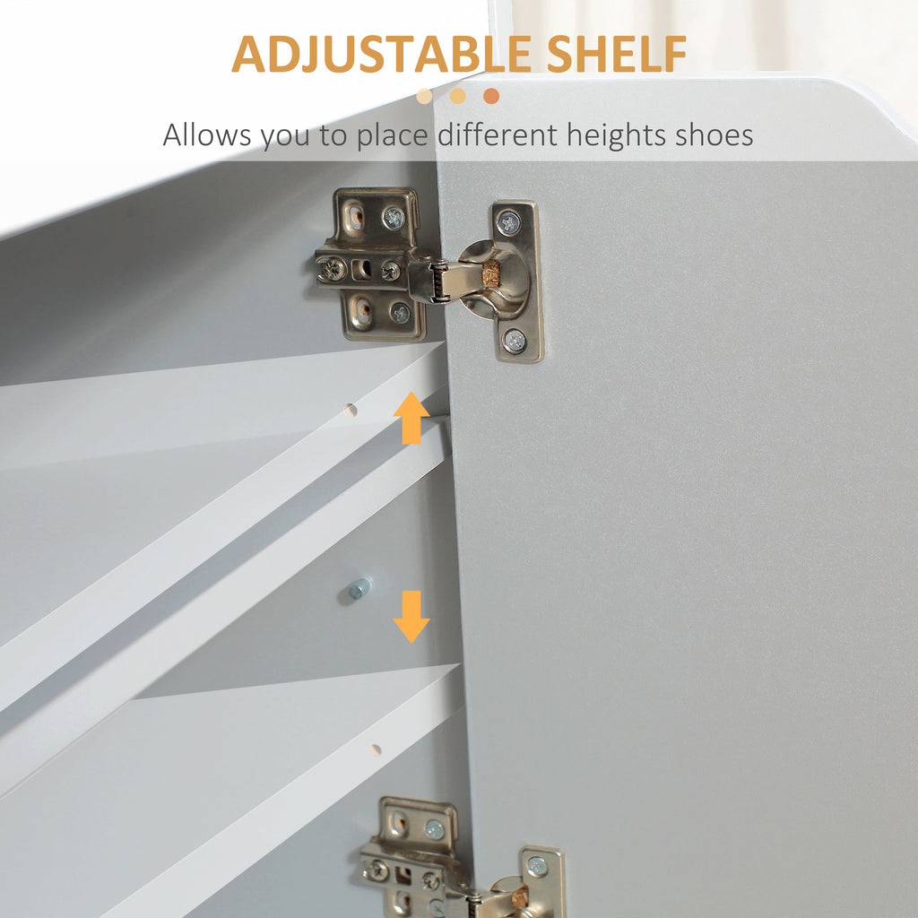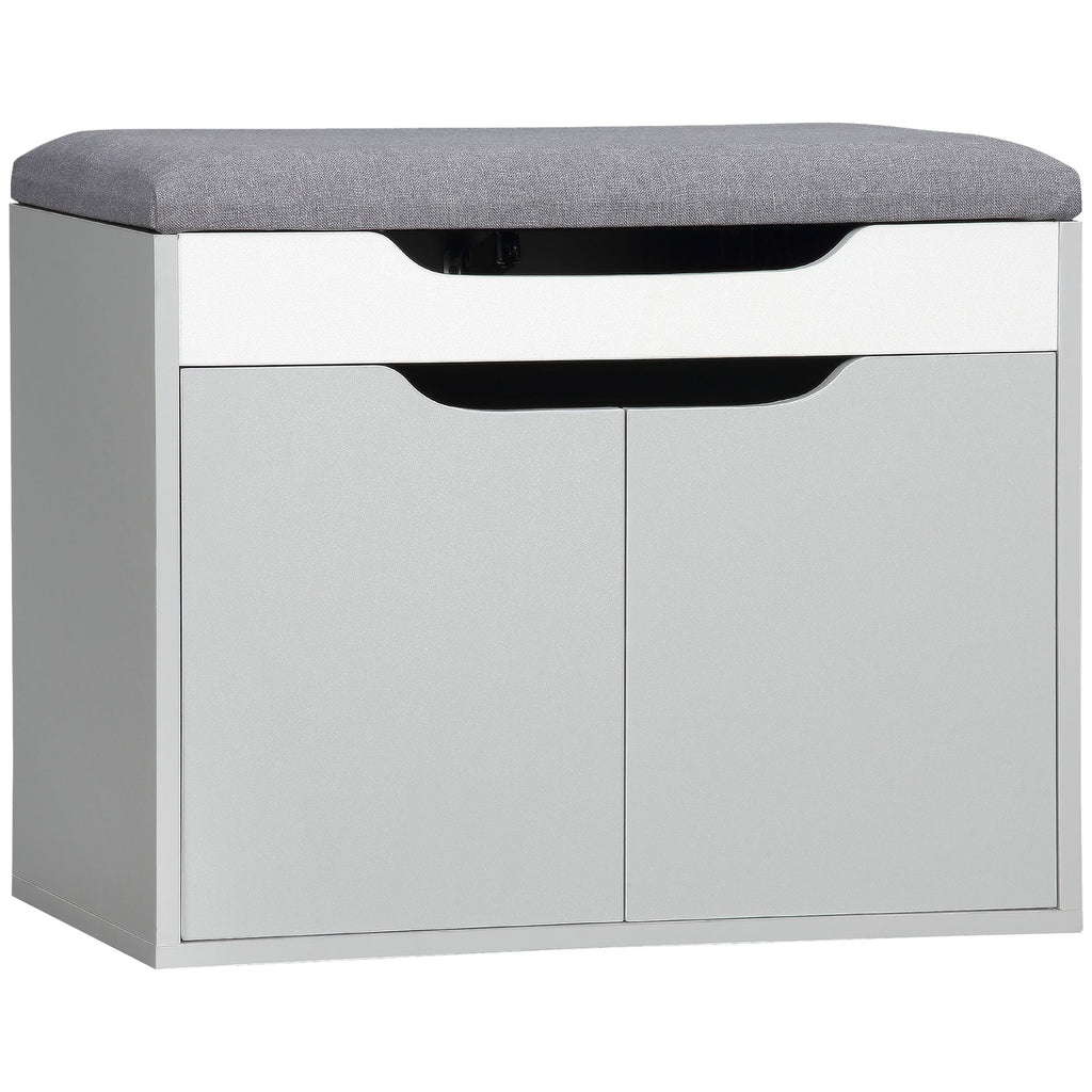 A compact and comfortable shoe storage with seat, from HOMCOM. Keep this shoe bench in your hallway for convenience when leaving and entering the house. It comes with a cupboard with adjustable shelf to keep four pairs of shoes in (approx.) It also features a small top compartment for little bits and bobs - concealed up the padded lift up lid, which also acts as a seat when putting shoes on and taking them off. Completed with handy groove handles.