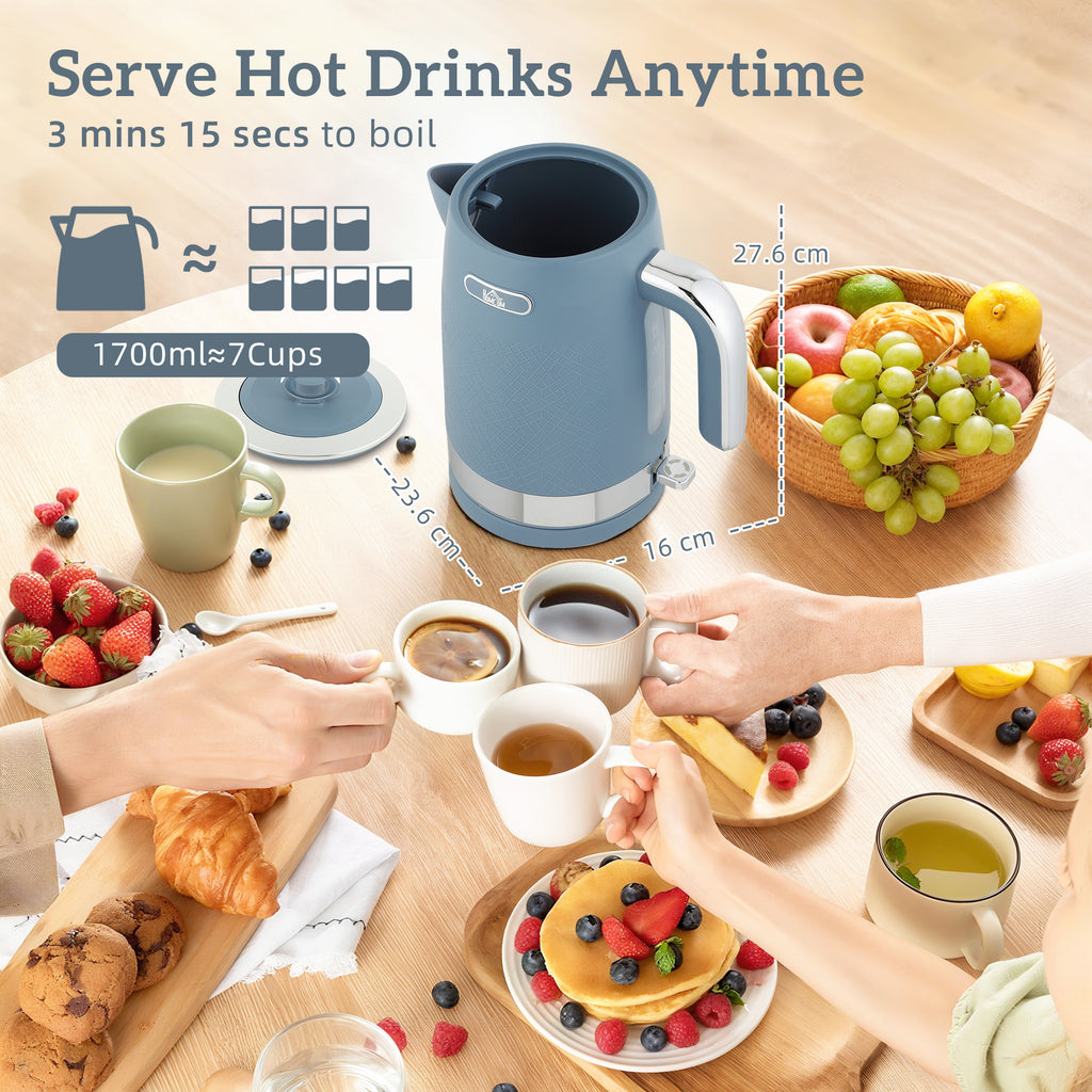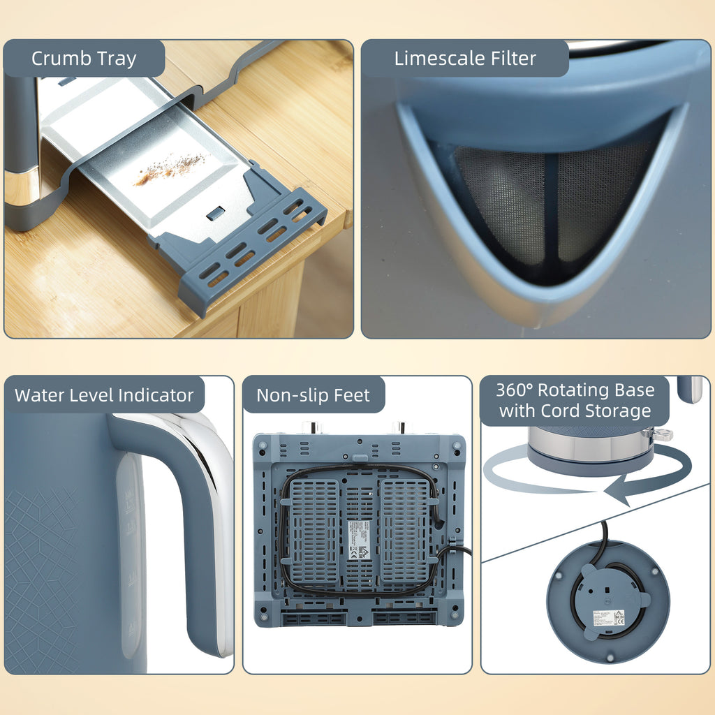 Super sleek, with a touch of texture: welcome this HOMCOM kettle and toaster set onto countertops. Both pieces blend a curved shape, with polished metal accents and in a matte colour finish with a touch of texture - a distinctive set for your kitchen. Fitted with an Otter thermostat, the 1.7L kettle boils water within minutes, so everyone can enjoy a hot drink quickly. The wide slot four-slice toaster has seven browning levels to enjoy just how you like it.