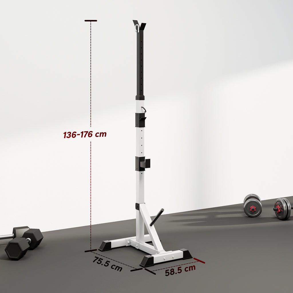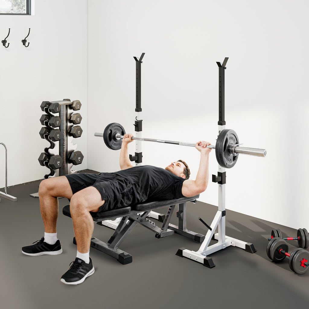 Bring gym workouts to your own home with this barbell rack from HOMCOM. Formed heavy-duty steel, the frames are tough and sturdy for long-lasting use, able to hold up to 200kg with ease. They can be set to different levels with a 'J' shaped bracket on the top for extra room. Both racks are finished with 'H' shaped bases to ensure stability, with rubber covers on all sharp edges for safety. An excellent way to work on squats, bench presses, lunges, deadlifts and more during any time of the day.