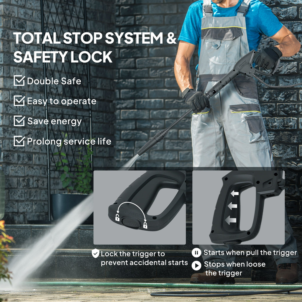 - 1800 W motor, with maximum 150-bar pressure. Provides 420 L water hourly