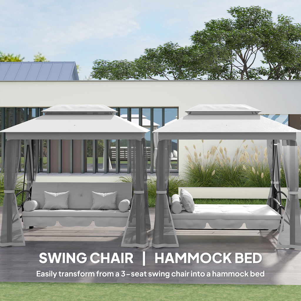 The 3 seaters multi-functional swinging garden chair can be converted to a single bed in seconds. With cushions, two soft pillows and two neck rolls, swing seat with canopy offers optimal comfort whether you are sitting or lounging. The removable zippered mesh curtains on all sides protect you against mosquitoes and allow for fluid air circulation. The gazebo swinging chair bench with a 300kg weight capacity allows you to relax on the comfortable swing chair hammock with your loved ones.