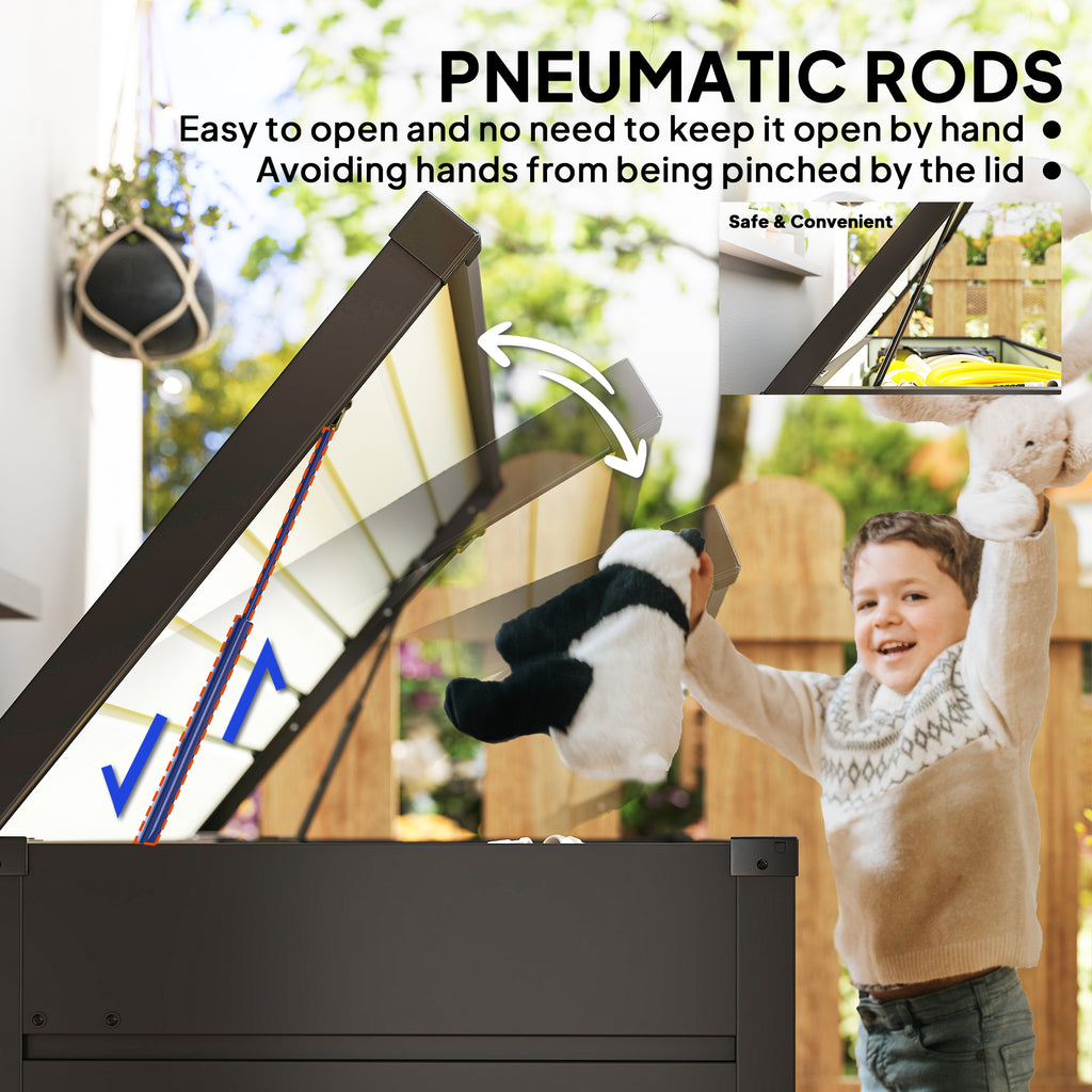 For protected outdoor storage all year round, this Outsunny box is your answer. Made from galvanised steel with a powder coating, this is a tough piece which is suitable for use outdoors in all types of weather. The 311L capacity offers plenty of space for garden tools and equipment, complete with pneumatic rods on the lid for slow and safe opening and closing. Fit with a cushion on top so you can sit comfortably.