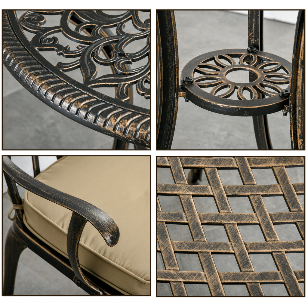 Transform your garden into a haven of elegance with the Outsunny three-piece cast aluminum garden coffee set. Tailored for gardening enthusiasts, this exquisite bistro set combines durability with timeless beauty, effortlessly withstanding diverse weather conditions. The intricately designed chairs and matching table offer unparalleled comfort, making them perfect for leisurely afternoons spent savoring tea. Elevate your garden's aesthetic appeal while enjoying luxurious relaxation.