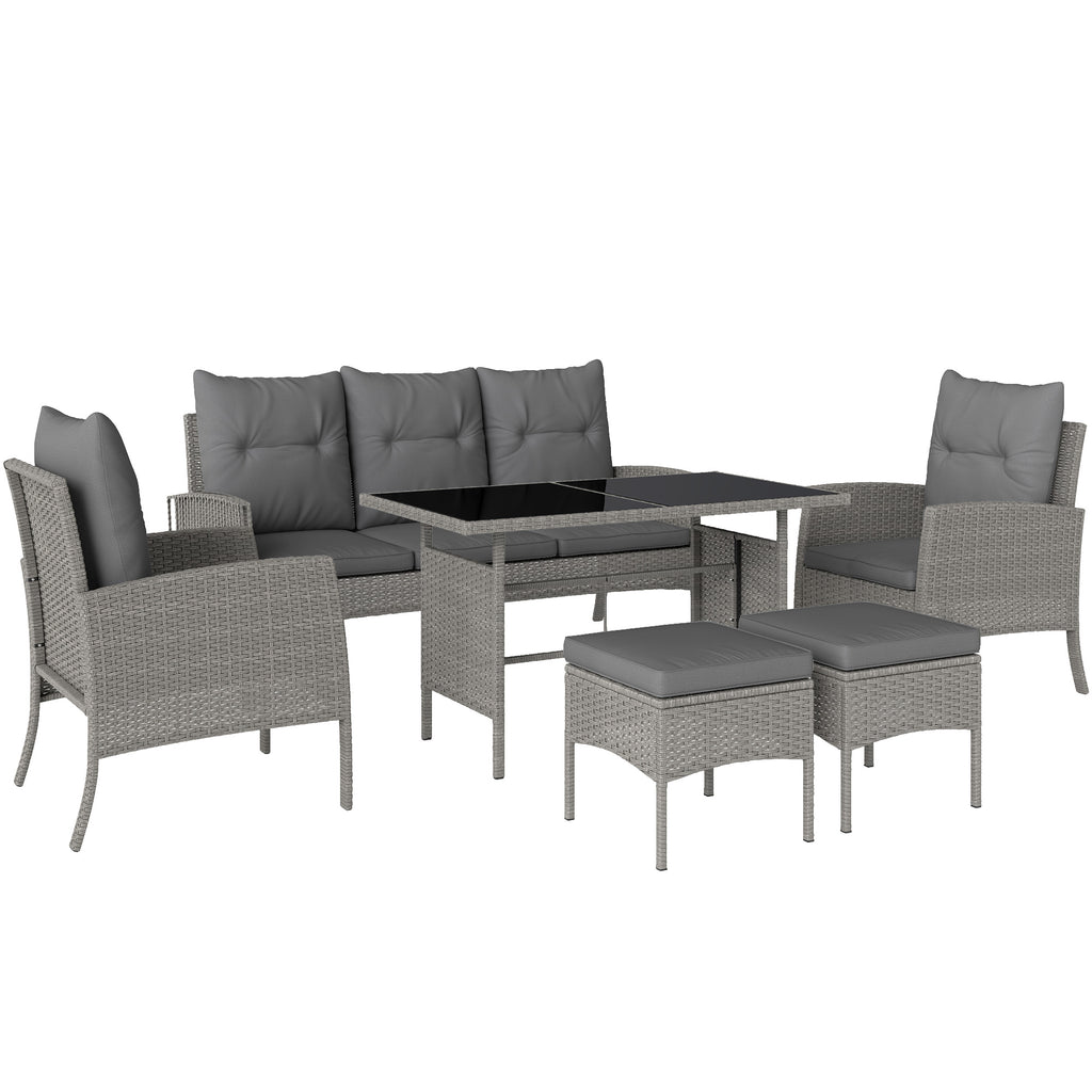 Your excellent company to gather round under the sun-say thanks to this Outsunny rattan garden furniture set. Each piece has a strong, powder-coated steel frame wrapped with plastic wicker - a stylish rattan look, which also protects the steel frame. The outdoor sofa comes with two armchairs, two footstools, a three-seater sofa and a matching dining table. All seats and footstools come with padded cushions for comfort. Note: Two people are required to build this garden set.