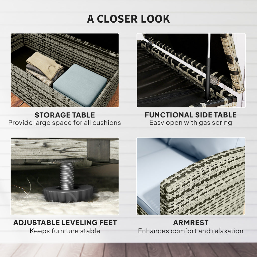Bring a touch of colour to your outdoors, with space to keep it tidy, thanks to this rattan sofa set from Outsunny. Powder coated steel frames of the garden furniture set for a tough structure are wrapped in PE wicker-adding extra strength and protection for garden use. Padded cushions ensure comfort and complement the mixed colour rattan. The storage of both tables of garden set helps you keep your space tidy at all times. Summer has never looked so vibrant.