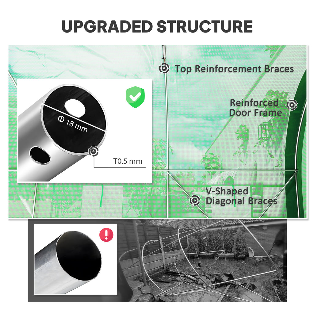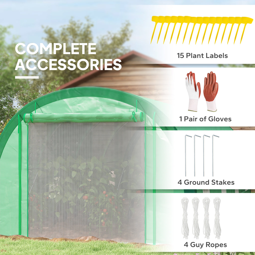 A large open design, this Outsunny 6 x 3m polytunnel greenhouse offers plenty of room for plants and more. Walk in and walk out - it's that spacious. A galvanised steel frame for a strong core, it comes with a two-layer mesh cover to create safe shelter inside; the middle reinforcement makes the cover extra tough. A large door for easy access, with eight windows to bring fresh air in easily. Set comes with 4x ground stakes, 4x guy ropes, 15x plant labels and 1x pair of gloves.