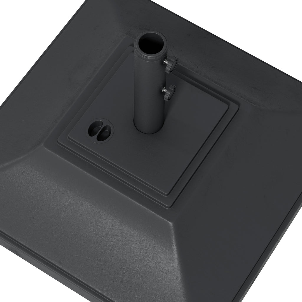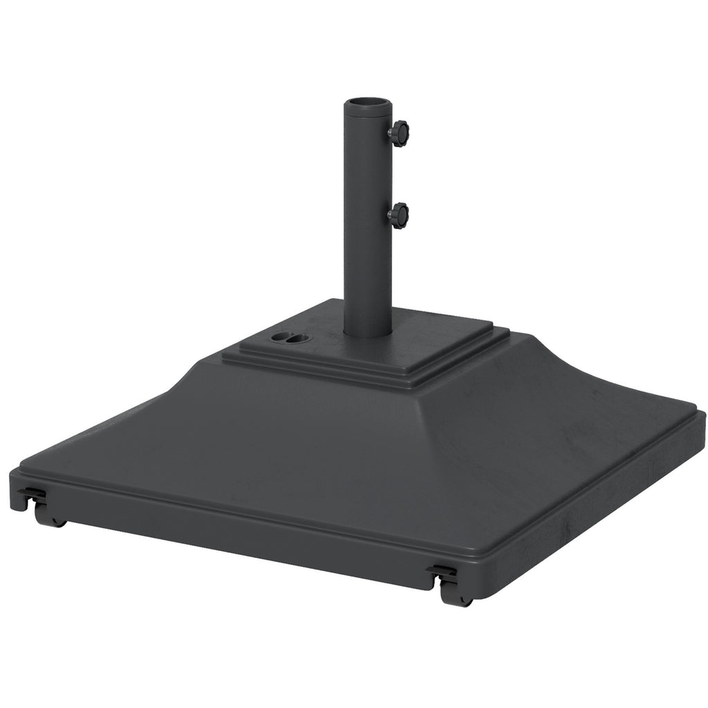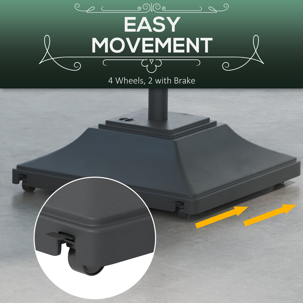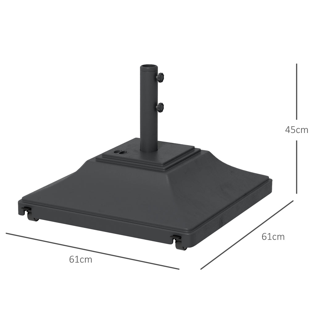 Keep parasol umbrellas firmly held in place: look to this Outsunny patio umbrella base. Made from strong HDPE plastic, this is durable piece, resistant to light wear-and-tear. It's fitted with four wheels to roll easily when full. Fill with 45kg water or 60kg sand for plenty of weight. A powder coated steel pole for the parasol, complete with tightening screws to secure in place.