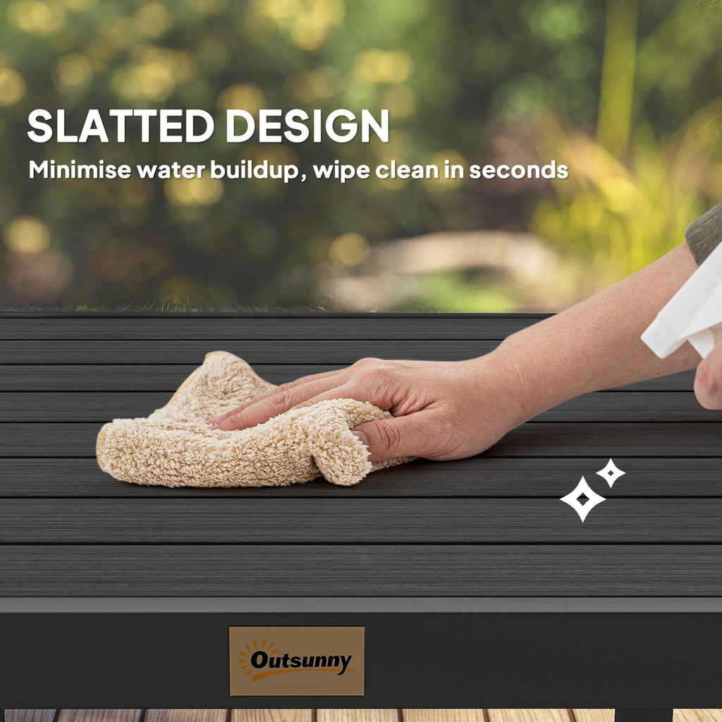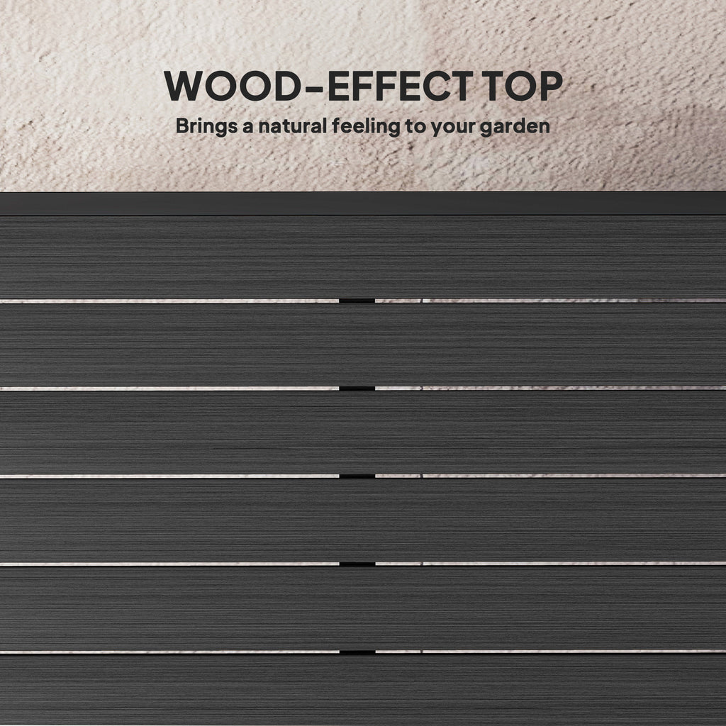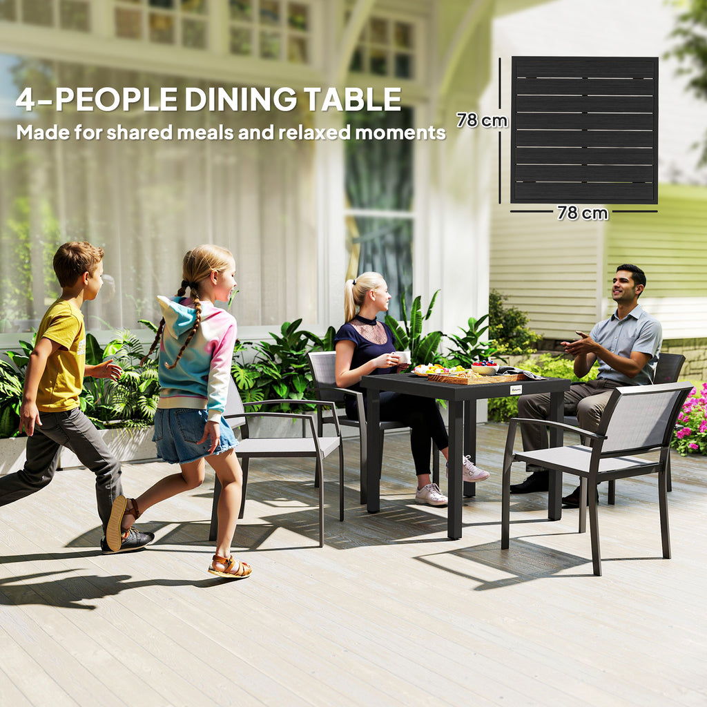 Serve dinner and seat 4 with Outsunny. This garden dining table is ready and stable whether placed on the patio, porch, or any other outdoor area. Made of water and weather-resistant plastic, it still offers the rustic style with less weight and easy cleanup. Supported by a square aluminium frame, it provides lots of space for 4 diners. This outdoor dining table on the balcony is great for dinner, drinks, afternoon tea, or coffee.