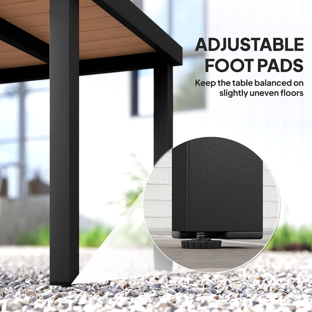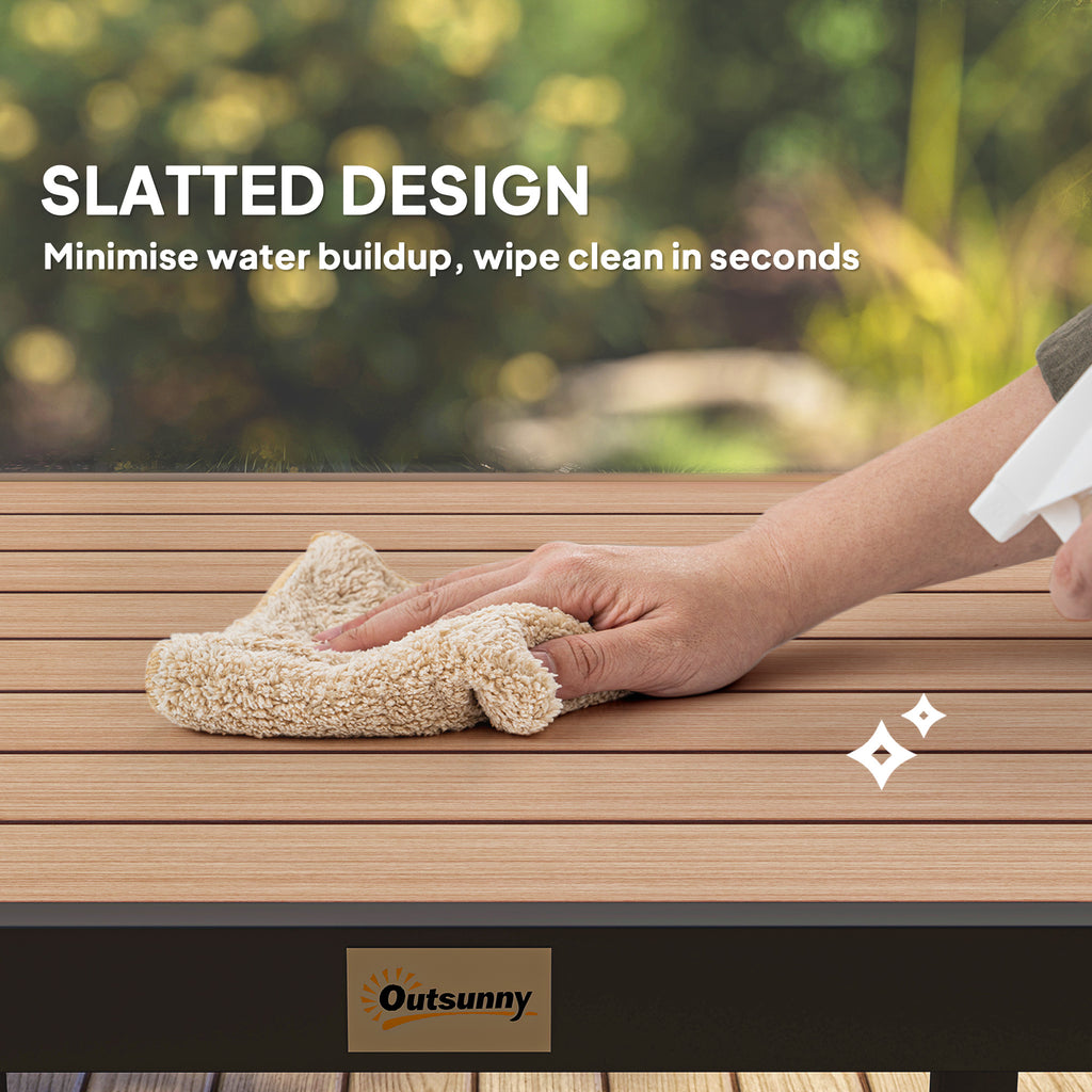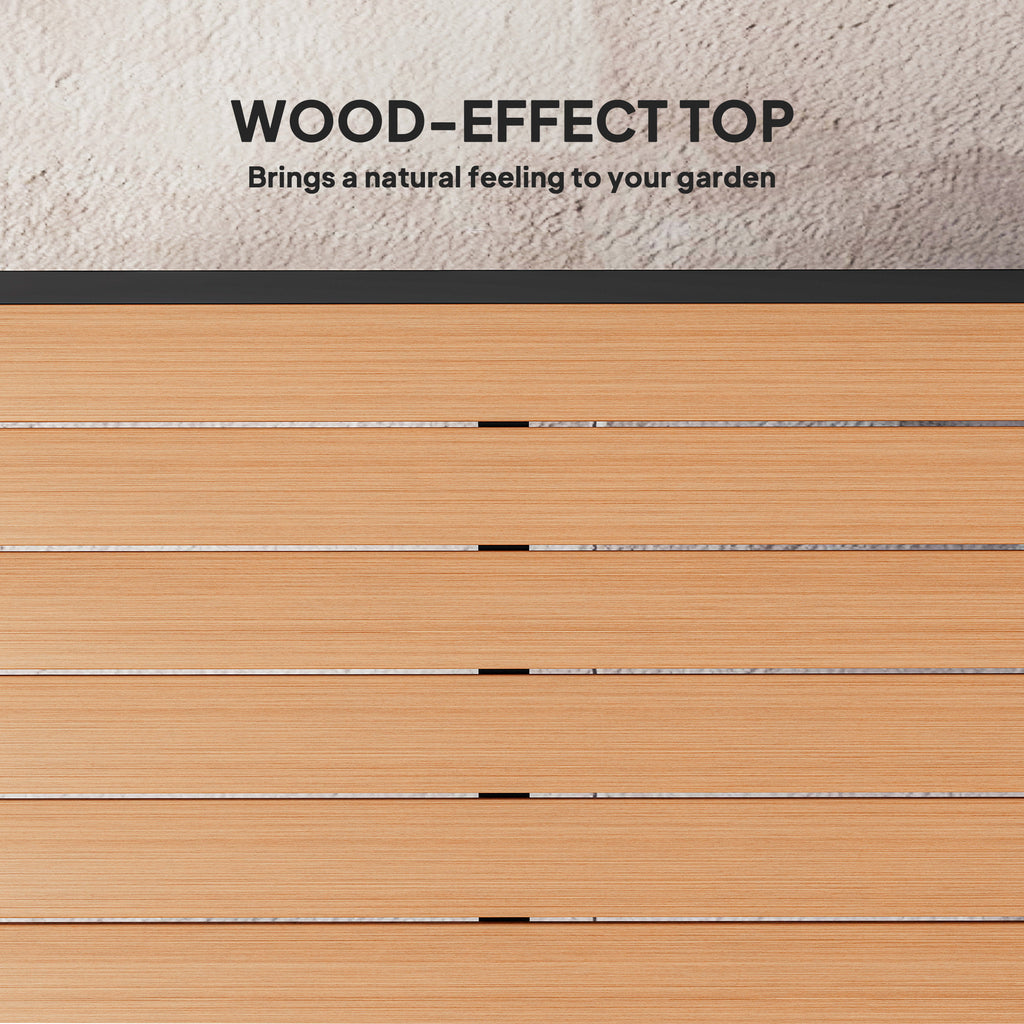Serve dinner and seat 4 with Outsunny. This garden dining table is ready and stable whether placed on the patio, porch, or any other outdoor area. Made of water and weather-resistant plastic, it still offers the rustic style with less weight and easy cleanup. Supported by a square aluminium frame, it provides lots of space for 4 diners. This outdoor dining table on the balcony is great for dinner, drinks, afternoon tea, or coffee.