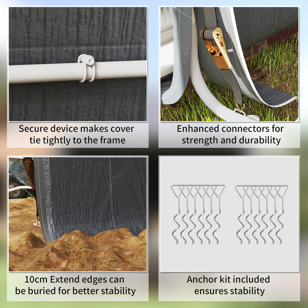 Garden storage shed just got serious. Go for this Outsunny 8 x 6.5ft outdoor storage tent. A metal frame for a strong core structure, with ground pegs included to pin to the ground for extra stability. It comes with a plastic fabric cover, keeping inside sheltered from light wind and rain. The front and back doors allows easy access in and out. Whatever it is - garden/outdoor equipment, bikes and more, this outdoor storage shed will keep your items safe.