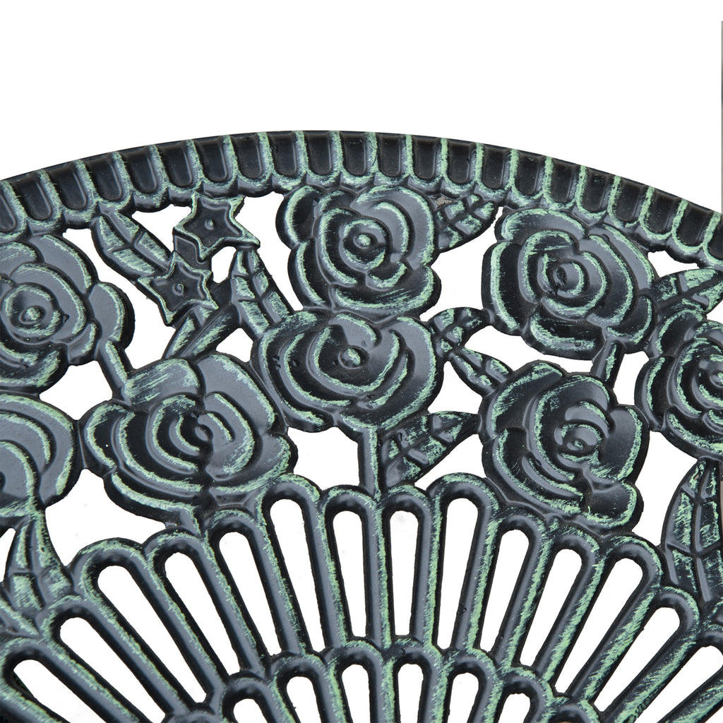 The bistro sets for 2 for garden will be a great addition to any patio area with its elegantly antique design. It is made from sturdy rust free cast iron and cast aluminum and molded into an antique green look. The legs of the table and two chairs are made of sturdy iron, which provides a stable place to rest. Whether in your backyard, patio, deck or even your restaurant outdoor dining space, you'll enjoy these garden bistro sets for years to come.