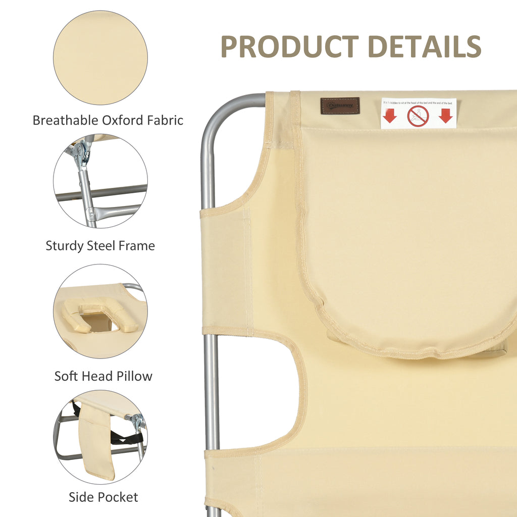 A cool update on the foldable sun lounger from Outsunny. Features a padded head hole at the front to allows you to rest your face in comfortably, which is perfect for relaxing or even reading a book! The powder coated steel frame is strong and solid to support up to 120 kg. The reclining backrest is five positions adjustable, easy to set and lock to a position you like best. Complete with a handy side pocket.