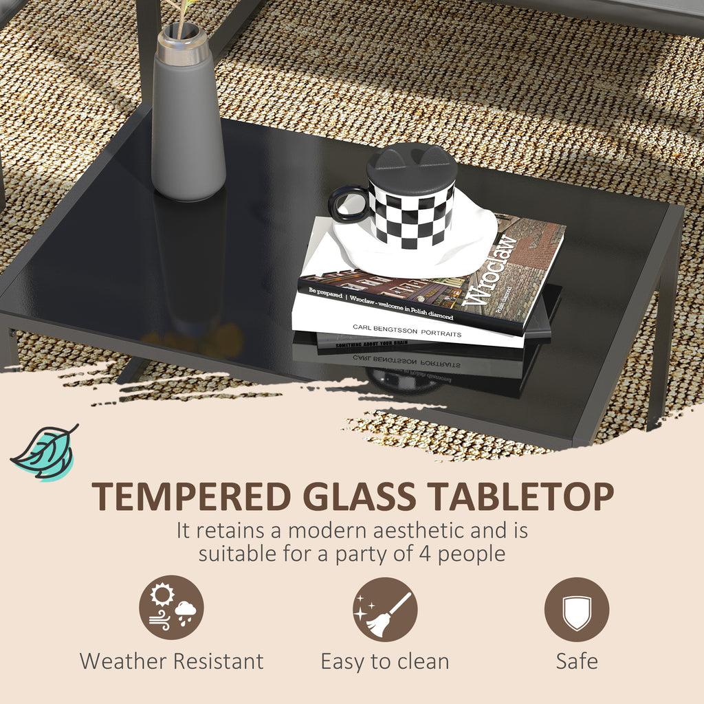 Let friends and family gather around in simple yet sleek style outdoors, thanks to this Outsunny garden set. Comes with four pieces – two armchairs, a two-seater sofa and a dining table; all with steel frame for a tough and strong structure. Thick padded cushions on the seats and backs for comfort as you relax. A tempered glass on the long table adds a beautiful finish, with protective pads on each foot for balance.