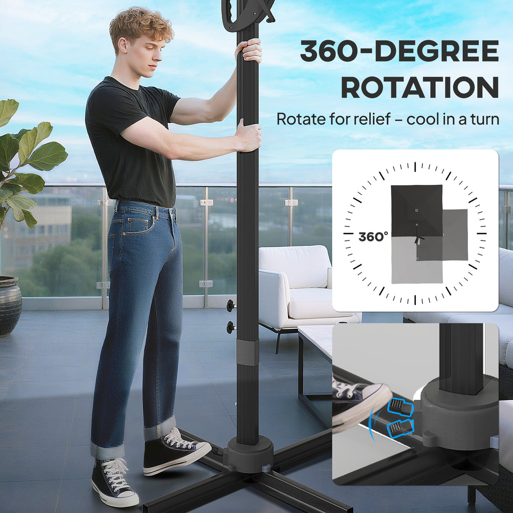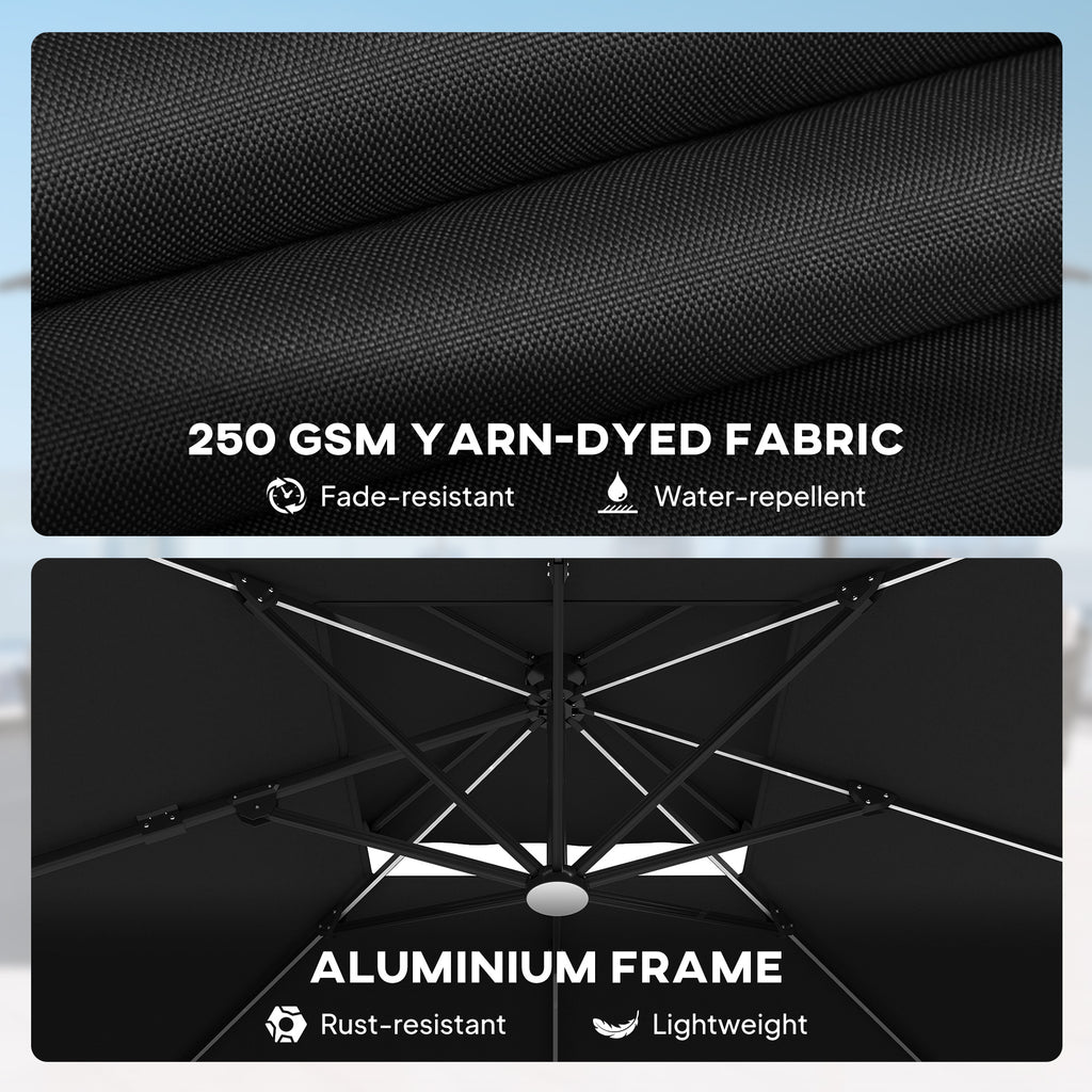 Fitted with solar-powered LED lights, this Outsunny parasol emits a warm white glow - still relax outdoors as the sun sets. The UPF 50+ canopy provides excellent sun protection, while the tiltable design and 360° swivel keep you cool and protected from every angle. Plus, the long strap secures the canopy for easy storage. Cross base included, weights are required.