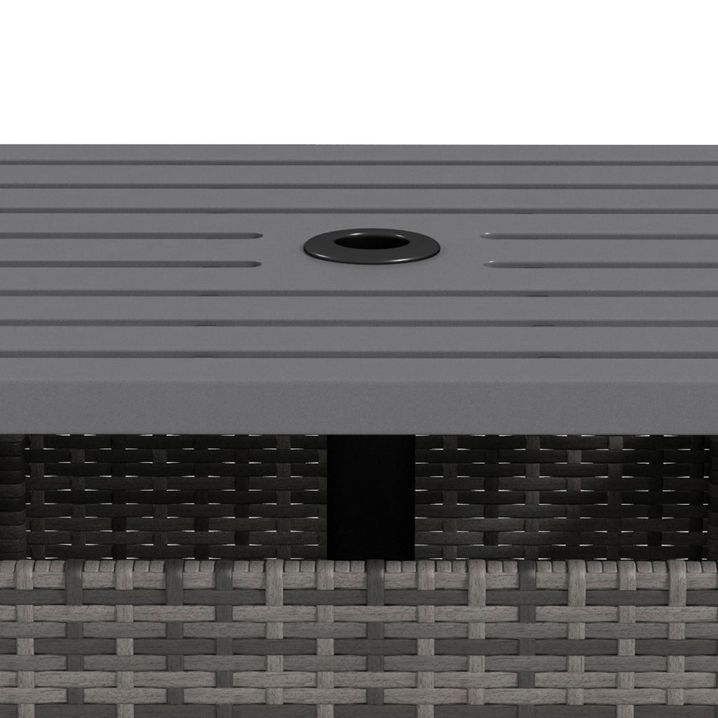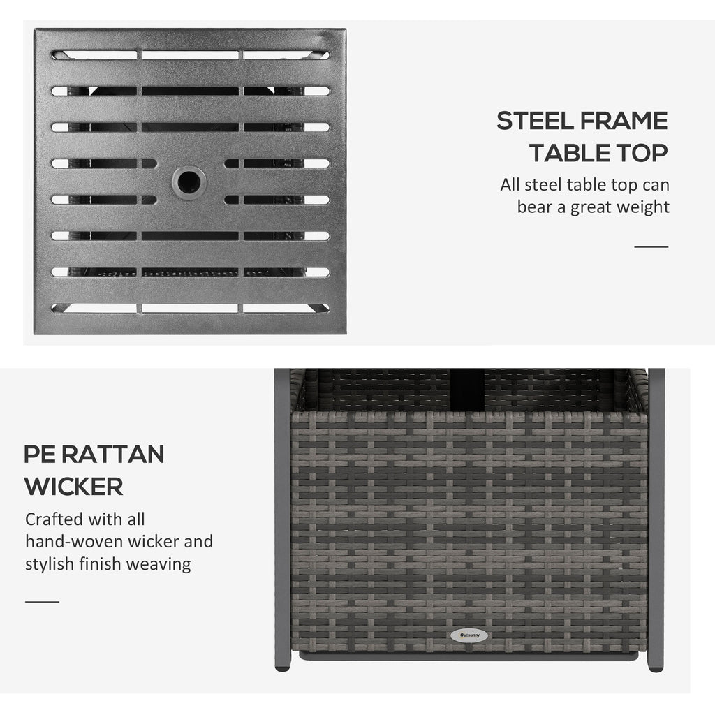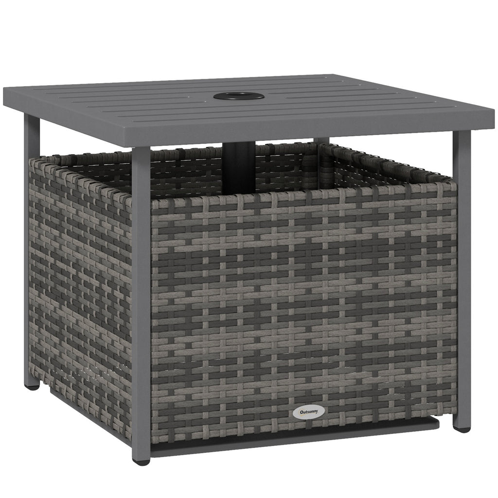 Style and function are blended into together with this outdoor table from Outsunny. It has three features: the tabletop, the under-table storage box and the umbrella hole. The hole fits parasols with 4cm diameters or less, keeping you protected as you relax. The box features rattan walls for style and offers convenient storage. The tabletop is made from powder coated steel for a solid and flat holding space. It'll make your time relaxing outdoor easy and stress-free this summer.