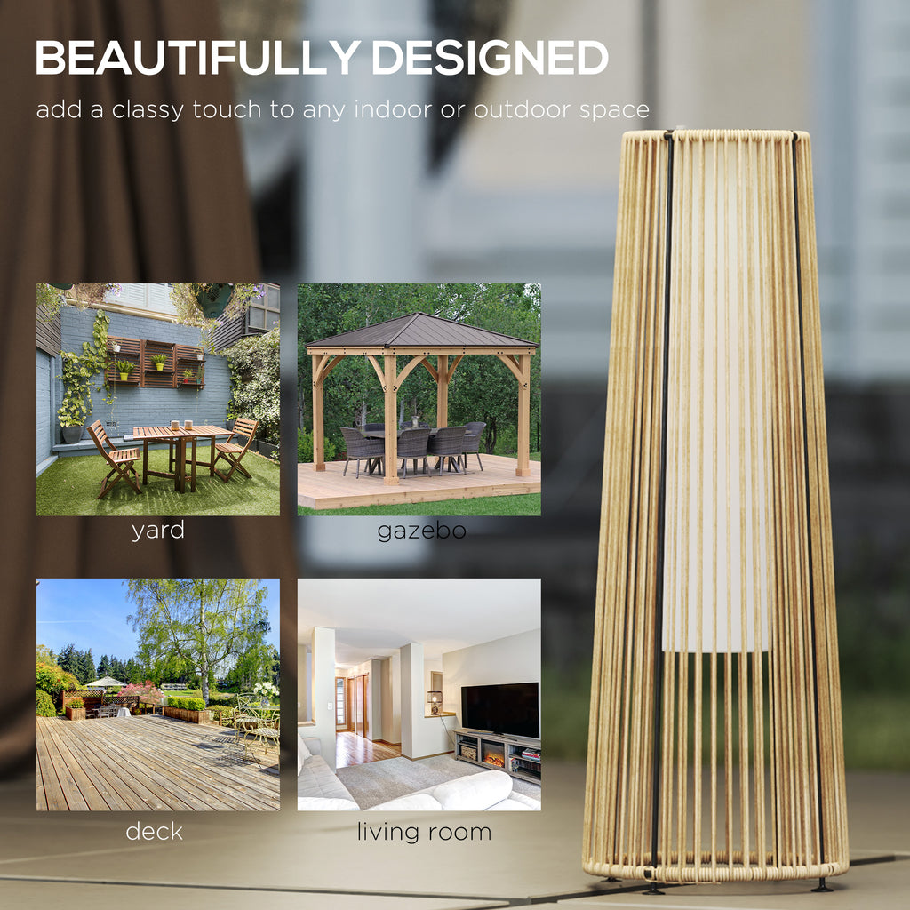 This solar powered lamp from Outsunny is a sophisticated touch for your outdoors this season. The structure made from steel, it's crafted into a graduating cylinder shade for a cool look which holds its balance. The stringed design is wrapped in PE wicker for a garden-appropriate look, which also protects the structure. Inside there are lights to illuminate your space at night. It automatically turns on and off and charges in the daylight, meaning no electricity connection is required