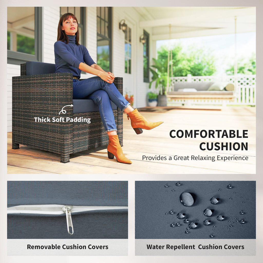 The comfy garden armchair from Outsunny. Made of a steel frame to prevent rust and damage outdoors, wrapped in rattan for easy cleaning and a mainstay in your garden furniture. Come with 10cm thick padded and plush cushions, as well as being water-resistant and having washable covers, with a high back and armrests for plenty of support—a great way to sit back and relax in the sun.