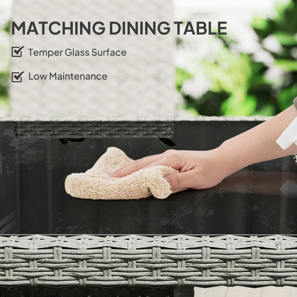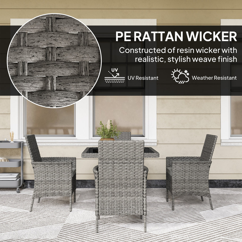 Enjoy alfresco dining with the Outsunny rattan dining set, a charming addition to any outdoor space. This 5-piece garden dining set, featuring four cosy chairs with washable cushions and a sleek table, promises comfort and style. Crafted from all weather double-strand half-round PE rattan with a robust steel frame, it's designed to weather the elements, making it a staple for any garden table and chairs collection.