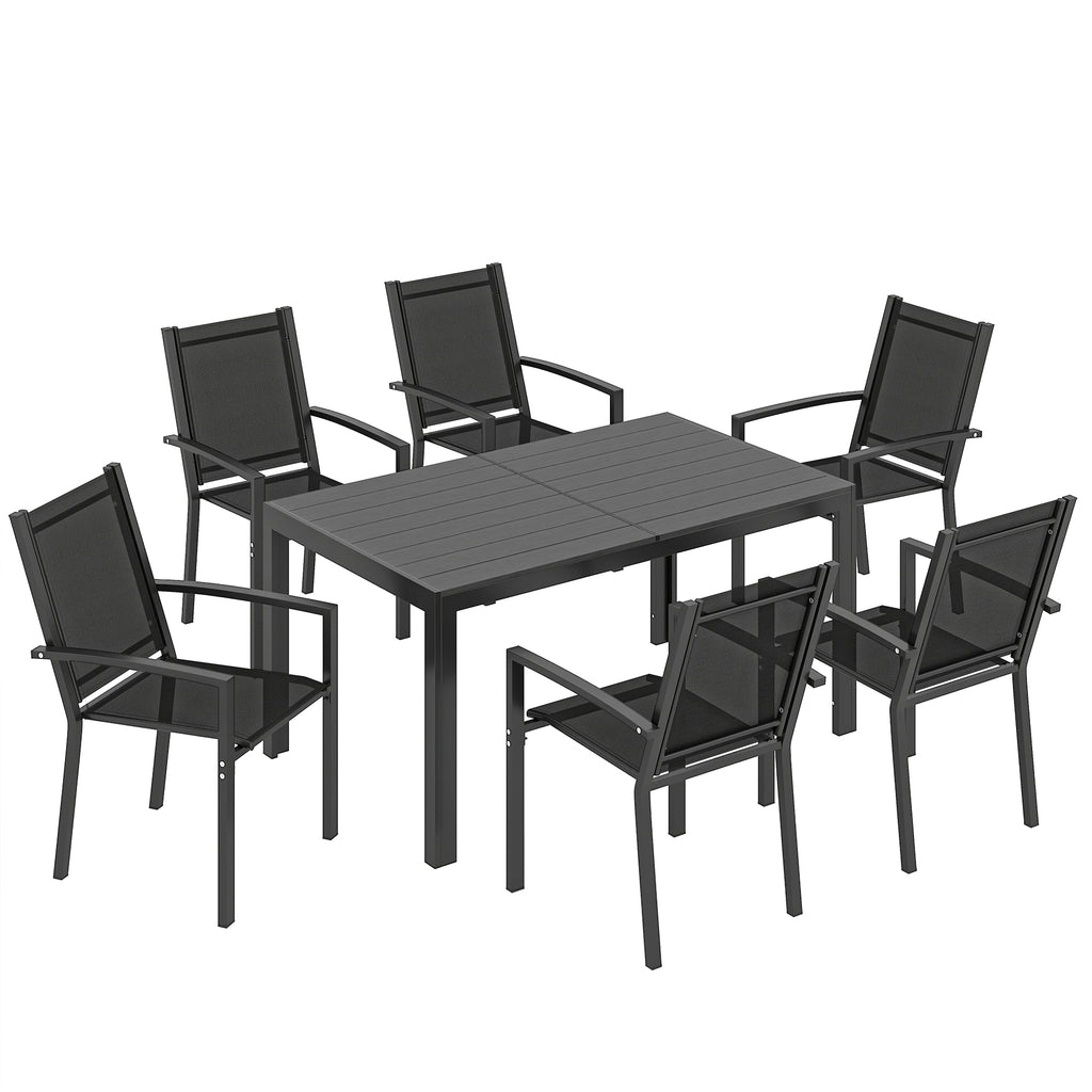 Whether it's for breakfast, brunch or dinner, this Outsunny seven-piece garden dining set brings everyone together. Six stackable chairs to sit with your favourite people, with the large table giving plenty of dining room. Made from plastic wood composite board, the tabletop is strong and low-maintenance. Our garden table and chairs are suitable for outdoor use: the teak-effect design is an excellent addition to outdoor spaces.