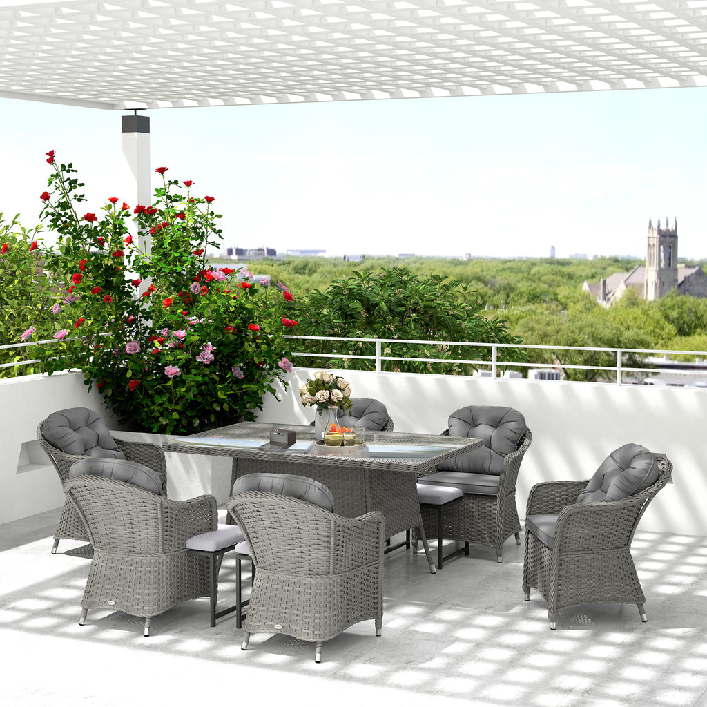 Bring everyone together outside, this season and beyond, with this Outsunny rattan garden furniture set. Includes six chairs and a large table - plenty of space for your favourite company. Each piece is made from powder coated aluminium for a strong core, wrapped in durable and stylish plastic wicker - a protective rattan shell. Keep safely shaded, thanks to the parasol hole in the glass-top table.