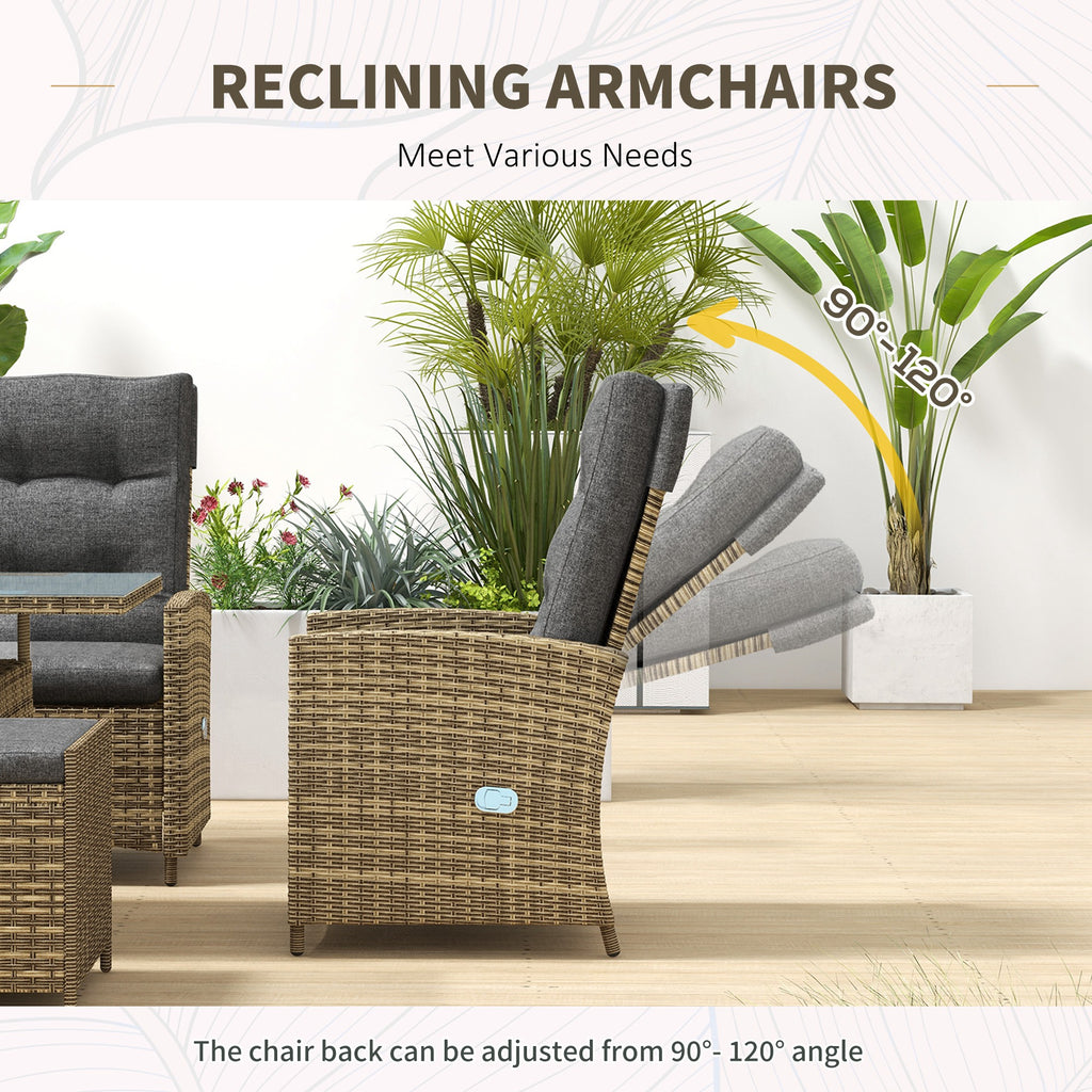 Sink into comfort, all day long. Look to this Outsunny six-piece rattan table and chairs set. Includes a loveseat, two reclining armchairs, two footstools and a two-tier table. The tempered glass top on the table creates a sleek look and a safe dining surface. A versatile outdoor dining set, made for many occasions.