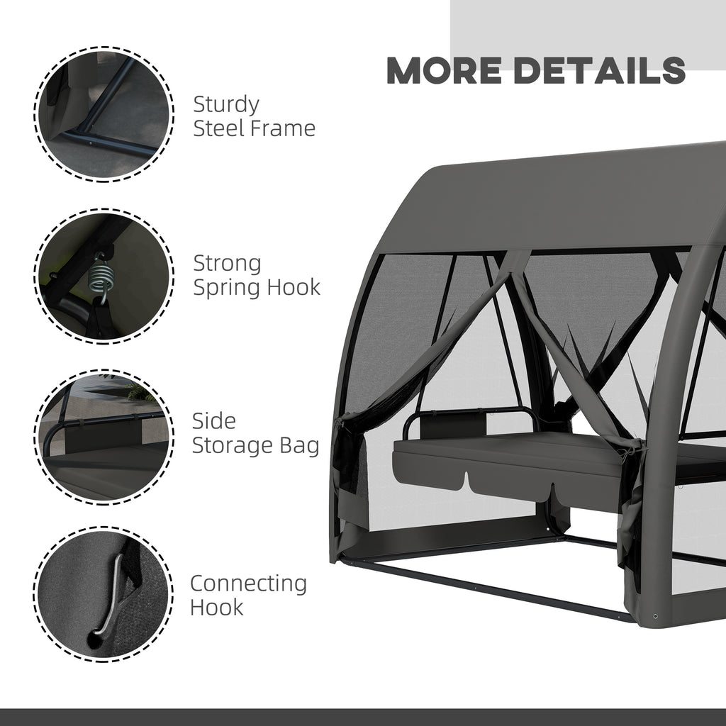Lie back and relax - with complete privacy. Not just a three seater garden swinging chair that folds down to make a bed, but this Outsunny garden swing bed comes with an outer UV-resistant mesh canopy. The powder coated steel frame means a strong core that supports up to 300kg. It's fitted with a three-seater swing seat, so there's plenty of room for you and friends. Complete with side bags for handy, close-by storage.