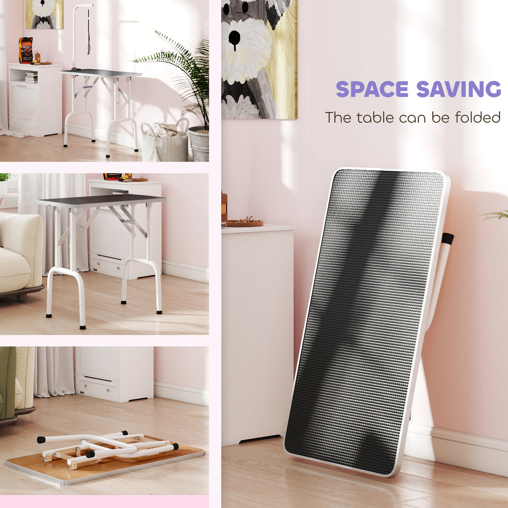 Enhance your pet's appearance with the PawHut dog grooming table. Suitable for various dog sizes, the grooming table features an adjustable arm, non-slip surface and secure leash for secure grooming. This foldable table offers easy storage and portability, ensuring your pet looks and feels great with minimal effort.