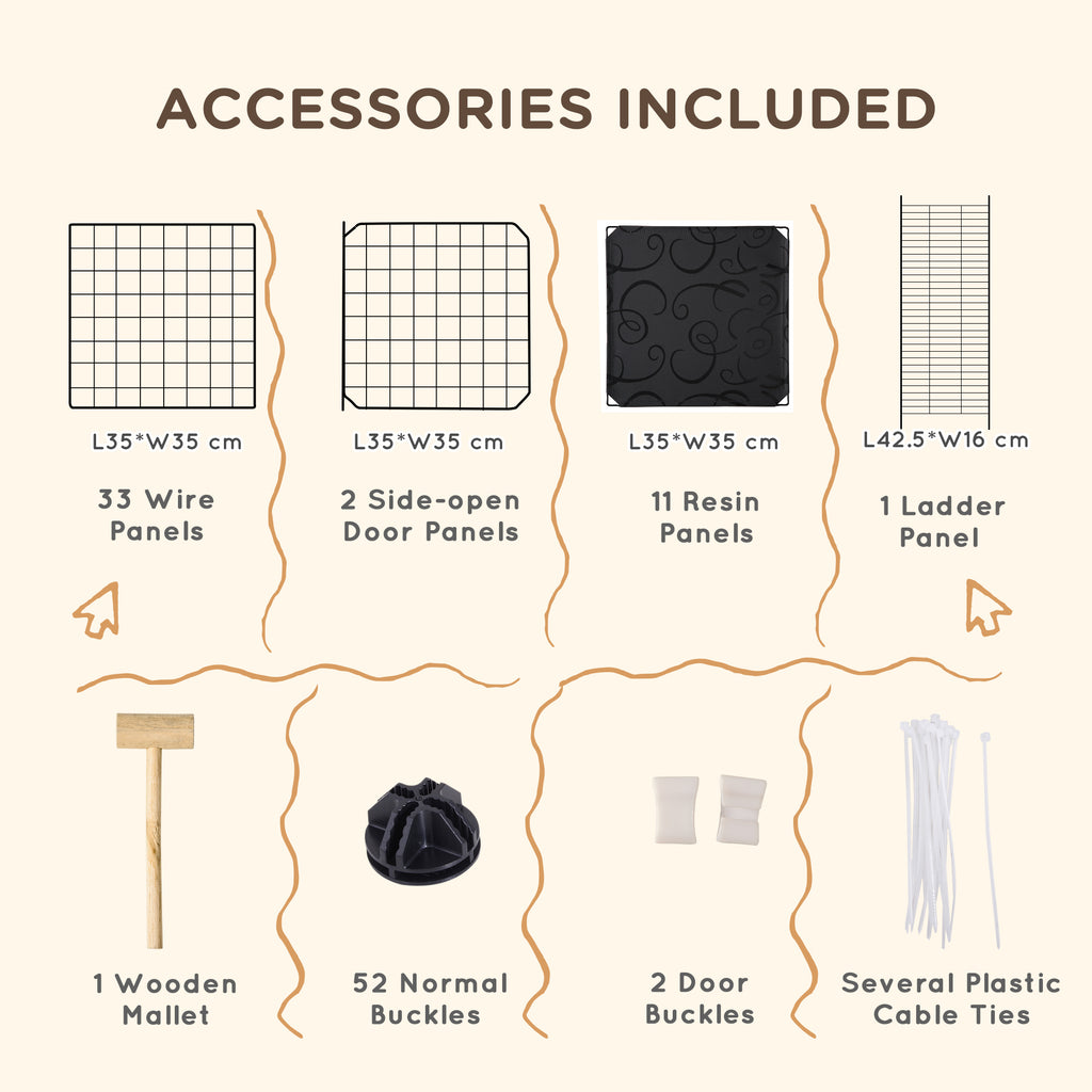 - This guinea pig cage comes with 33 wire panels, 2 side-open door panels, 11 resin panels and a ladder