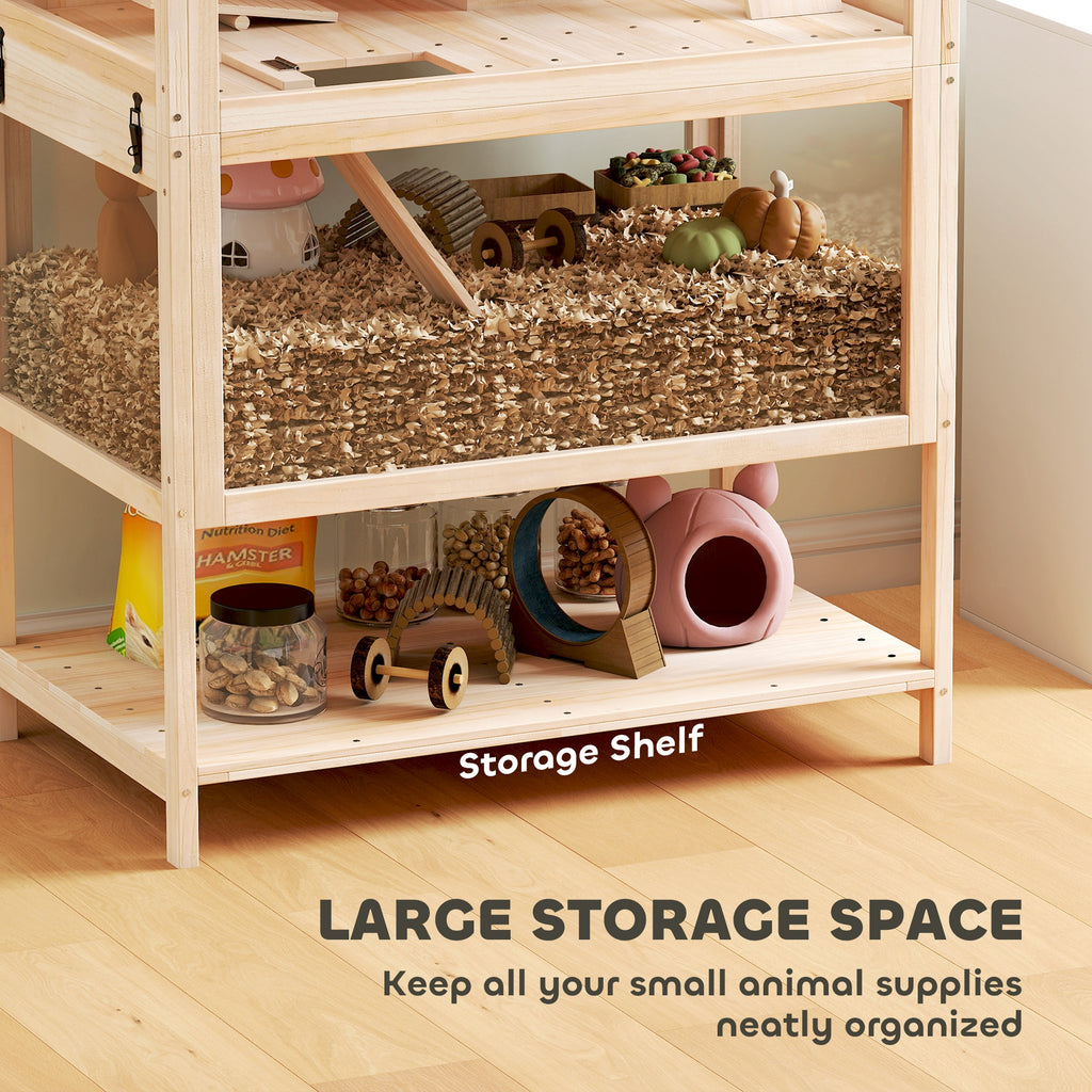 Small pets will love this PawHut hamster cage. The three-tier design with ramps, a seesaw, exercise wheel and cosy hut let hamsters and gerbils roam, relax and play freely. Two detachable middle layers and a large front door make cleaning quick and simple. A built-in storage shelf keeps food and tools within reach, while acrylic front and side panels let you watch your pet settle into their new home.