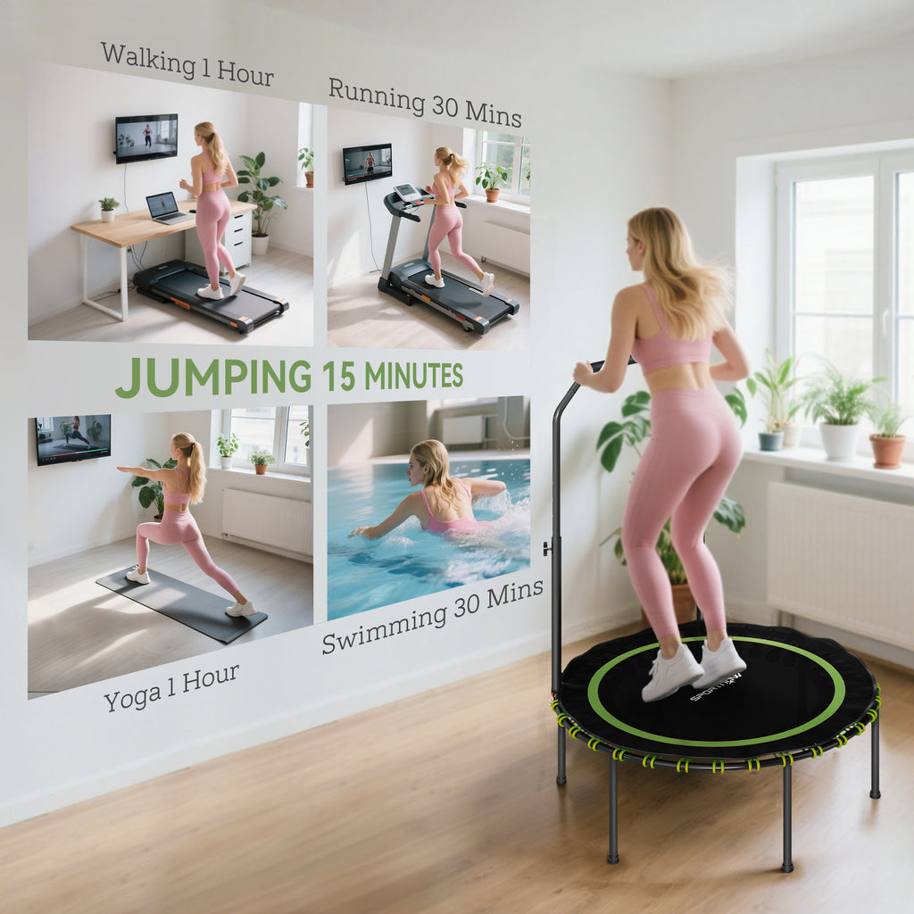 Stay active at home with the SPORTNOW mini trampoline, great for small spaces. Its five-level adjustable handrail offers balance and confidence, especially for beginners. Enjoy joint-friendly bouncing with 28 high-elasticity bungee cords. When done, fold it flat for easy storage. Amazing for home workouts!