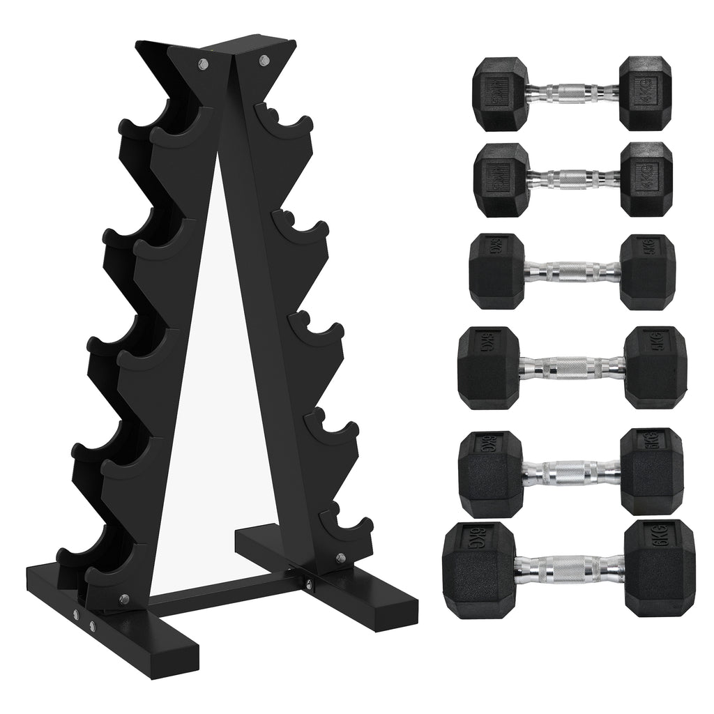 - Set includes a dumbbell rack and three pairs of dumbbells (2 x 4kg, 2 x 5kg, 2 x 6kg)