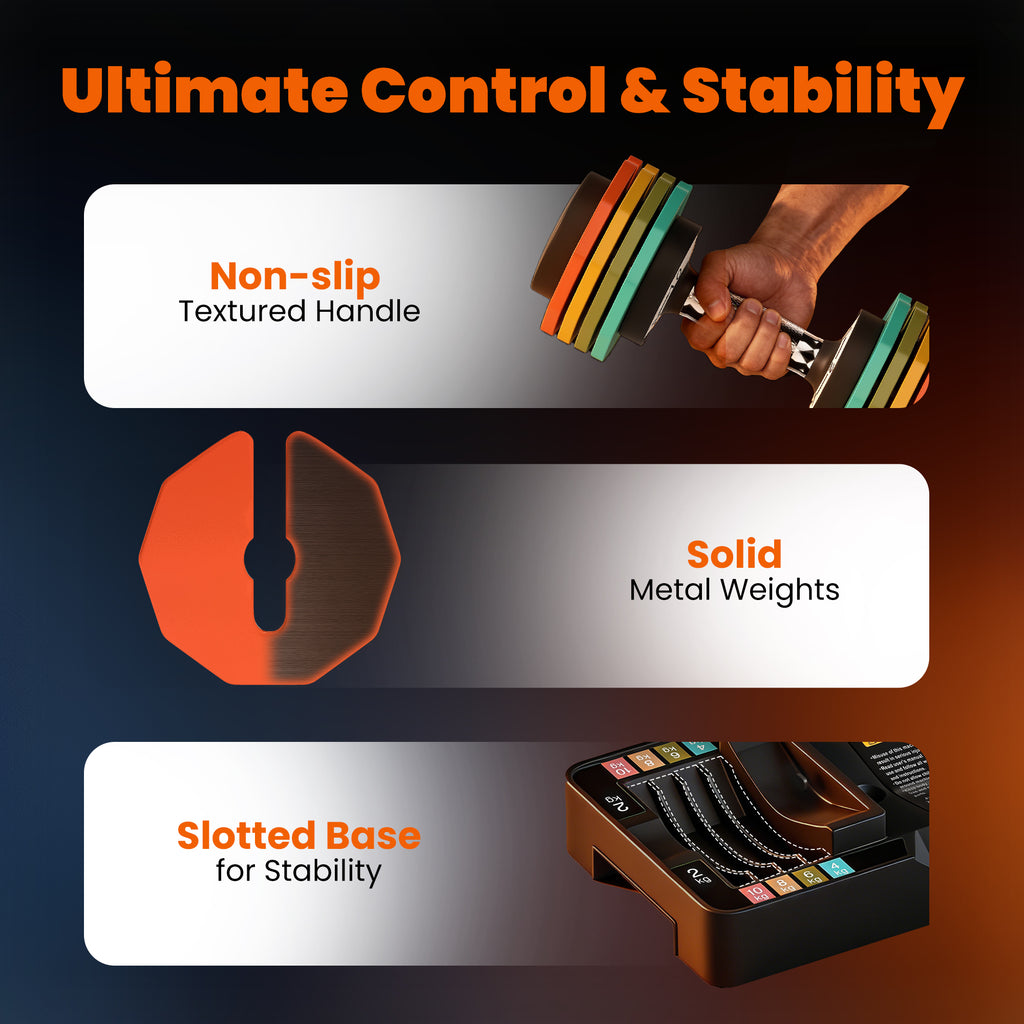- Compact and complete with a storage tray, this adjustable dumbbell set saves space and keeps your home gym tidy