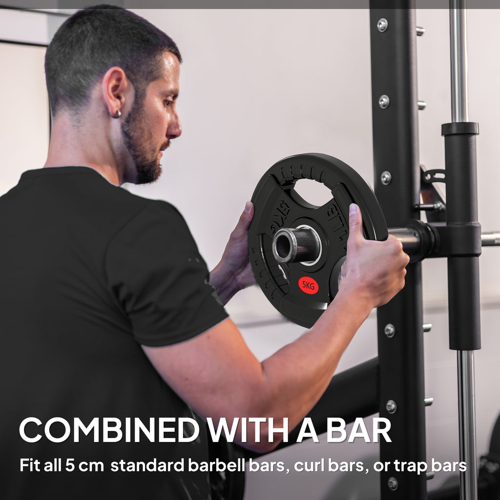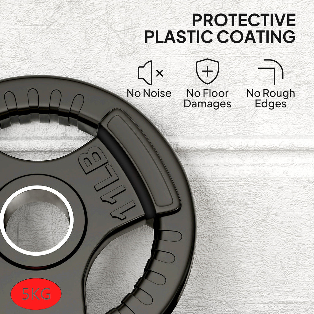 These SPORTNOW 2 x 5 kg Olympic weight plates are made from solid steel and feature a PVC coating for corrosion resistance, noise reduction and floor protection. Designed with three cut-out grip holes for easy handling, they fit all Olympic barbells with a 2" collar opening. Clear KG markings ensure easy identification and the versatile plates can also be used for a variety of exercises beyond barbell training.